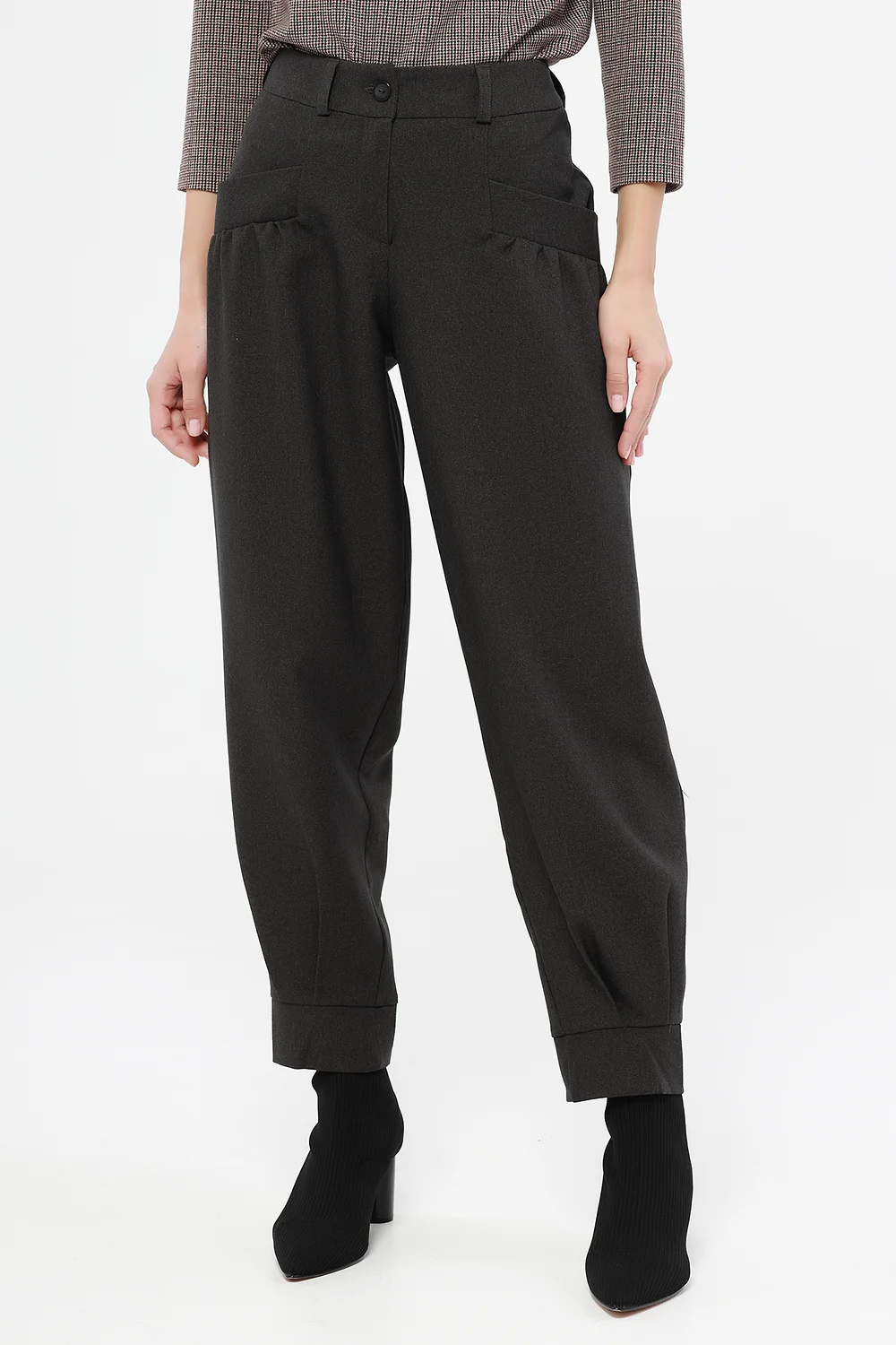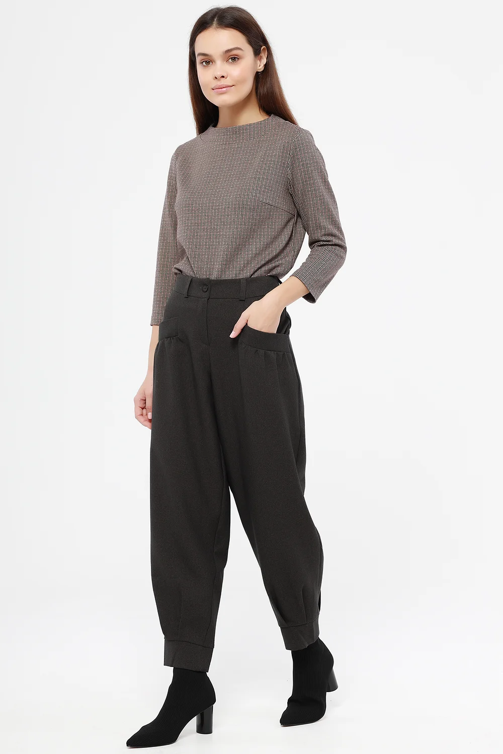 Брюки женские зауженные к низу со складками, на манжете. На полочке карманы с листочкой.