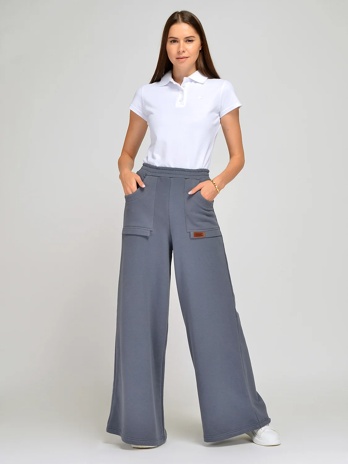 Расклешенные спортивные брюки.Спортивный брюки расклешенного кроя станут ярким элементом спортивного или повседневного образа. Высокая посадка и крой брючин визуально удлиняют ноги. На передней части брюк располагаются накладные карманы с декоративными клапанами и акцентным фирменным логотипом. Без застежки. Декоративный элемент логотип. Крой расклешенный к низу. Покрой прямой. Карманы накладные. Рекомендована стирка при температуре 30С. Благодаря крою, учитывающему особенности женской фигуры, Вы будете чувствовать себя не только комфортно и уверенно, но и женственно в широких спортивных брюках. Брюки с завышенной линией талии идеально сочетаются с комплектным свитшотом в тон из нашей коллекции, топом, футболкой или худи.