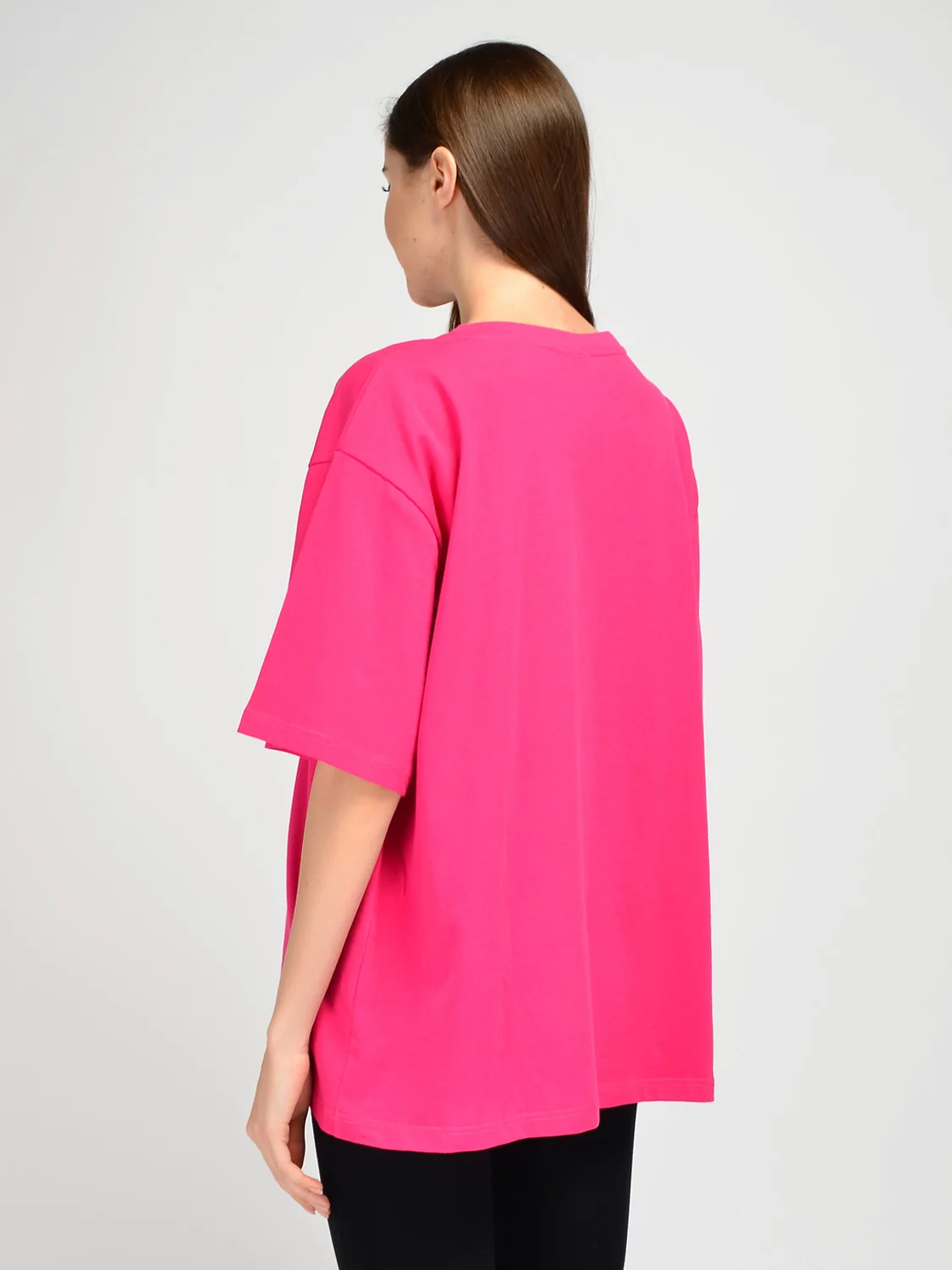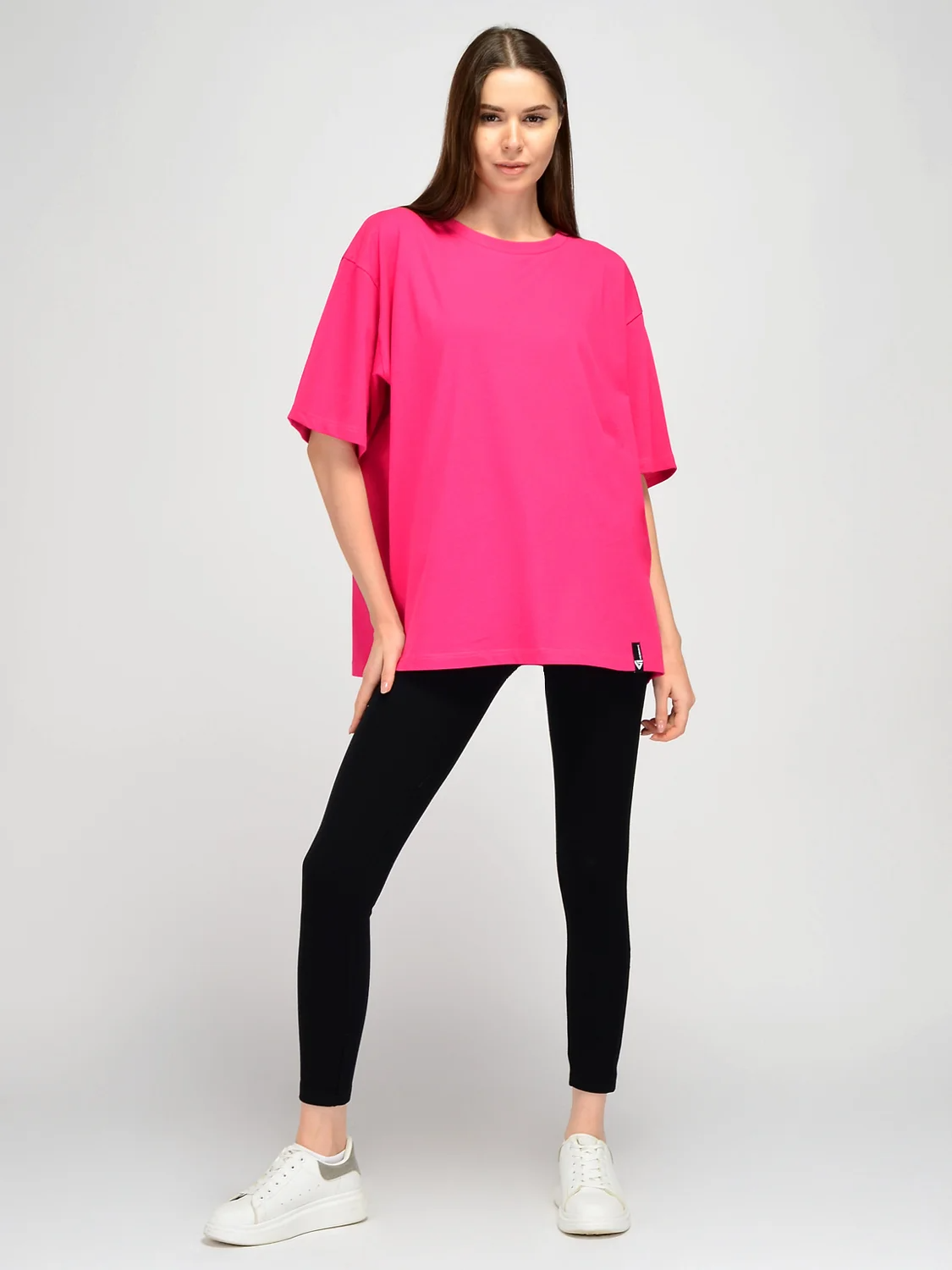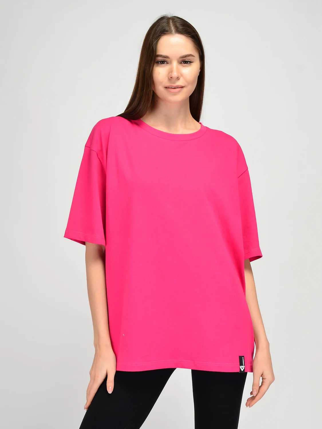 Базовая футболка оверсайз обеспечит Вам стильный и современный образ. Спортивная футболка прямого кроя удачно впишется в повседневный гардероб жарким летом или станет частью комплекта для активного отдыха или занятий спортом. Комфортный круглый вырез горловины не давит на шею. Удобные широкие рукава оставляют свободу движениям. Однотонная футболка свободного кроя имеет небольшой декоративный элемент: жаккардовый флажок на нижней части футболки с фирменным логотипом. Интересная деталь придает образу индивидуальности. Практичная футболка oversize выполнена из качественной хлопковой ткани, а это значит, что Вы будете носить ее с удовольствием не один сезон. Хлопковая базовая футболка будет уместна не только на прогулках или в поездках и путешествиях, но и может составить уютный домашний комплект. Широкий крой маскирует небольшие недостатки фигуры. Длина позволяет носить футболку как навыпуск, так и заправленной за пояс. Классическая модель сочетается со спортивными юбками, брюками, бриджами, леггинсами, а также с джинсами. Обувь выбирайте спортивную, на плоском ходу. Если дополнить образ крупными украшениями, получится стильный городской образ в стиле спортивный шик.