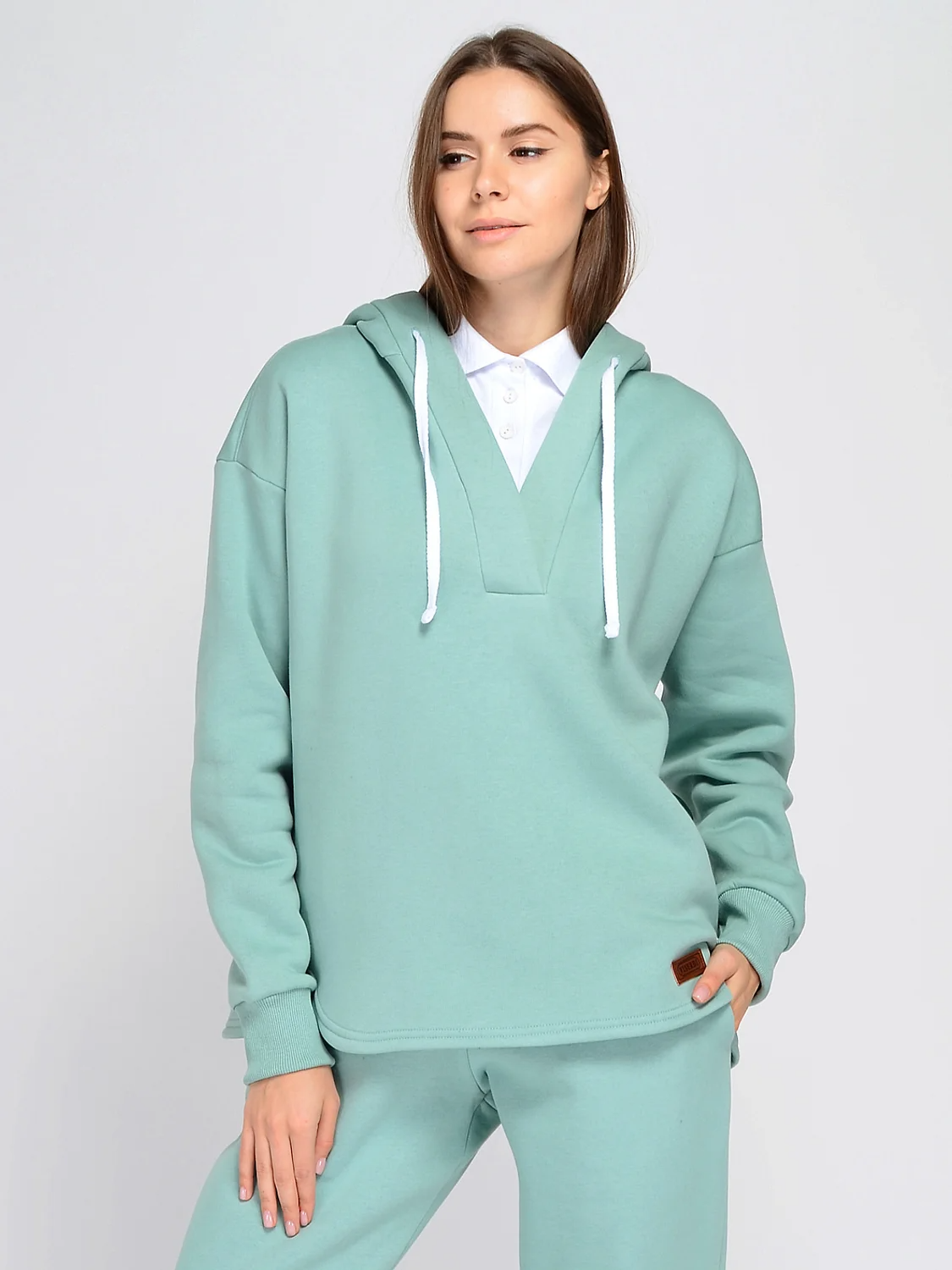 Эффектное женское худи с V образным вырезом и фирменным кожаным логотипом дополнит неповторимый модный спортивный образ. Плотная ткань с начесом обеспечит тепло и комфорт осенью и зимой.