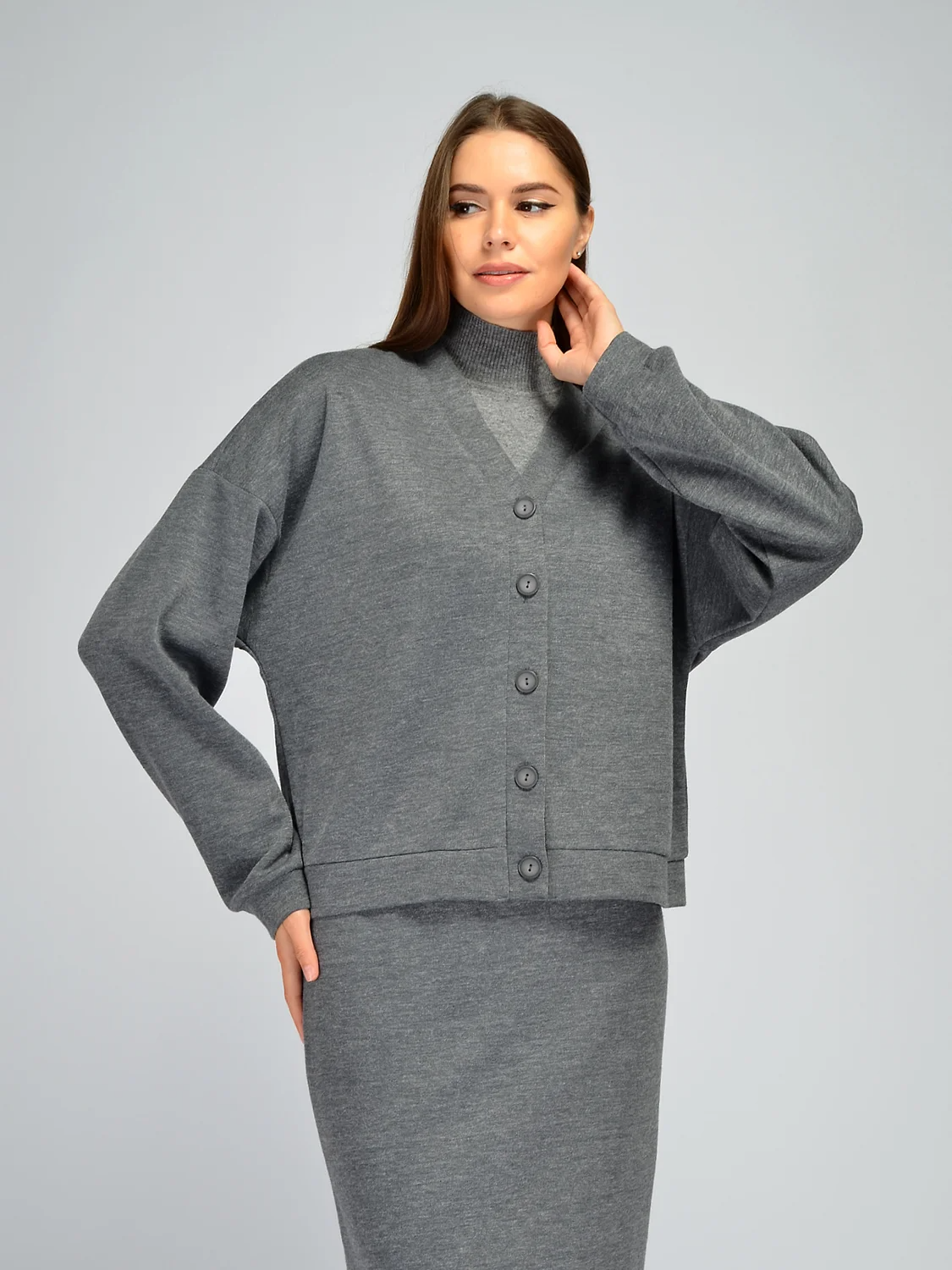 Теплый кардиган на пуговицах станет фаворитом в твоем гардеробе в прохладный сезон. Фасон оверсайз подразумевает спущенную линию плеча и свободный крой, который подарит ощущение уюта и комфорта. У кофты изящный V-образный вырез горловины, позволяющий продемонстрировать шейное украшение. Застегивается кофточка на пуговицы. Широкие рукава с манжетами обеспечат свободу движений и не будут доставлять дискомфорта. Базовый джемпер можно носить нараспашку, надев под него водолазку, футболку, рубашку или топ, а можно застегнуть на все пуговицы и носить как самостоятельную единицу. Изделие имеет оптимальную длину, которая подойдет девушкам и женщинам разного роста и комплекции. Кардиган идеально сочетается с комплектными брюками на резинке из нашей коллекции. Вы также можете его носить с джинсами, брюками, юбками. Кардиган подразумевает повседневный кэужал стиль, поэтому рекомендуем выбирать удобную обувь на низком ходу. Трикотажная вещь может также быть полезна в качестве домашней одежды в прохладную погоду.