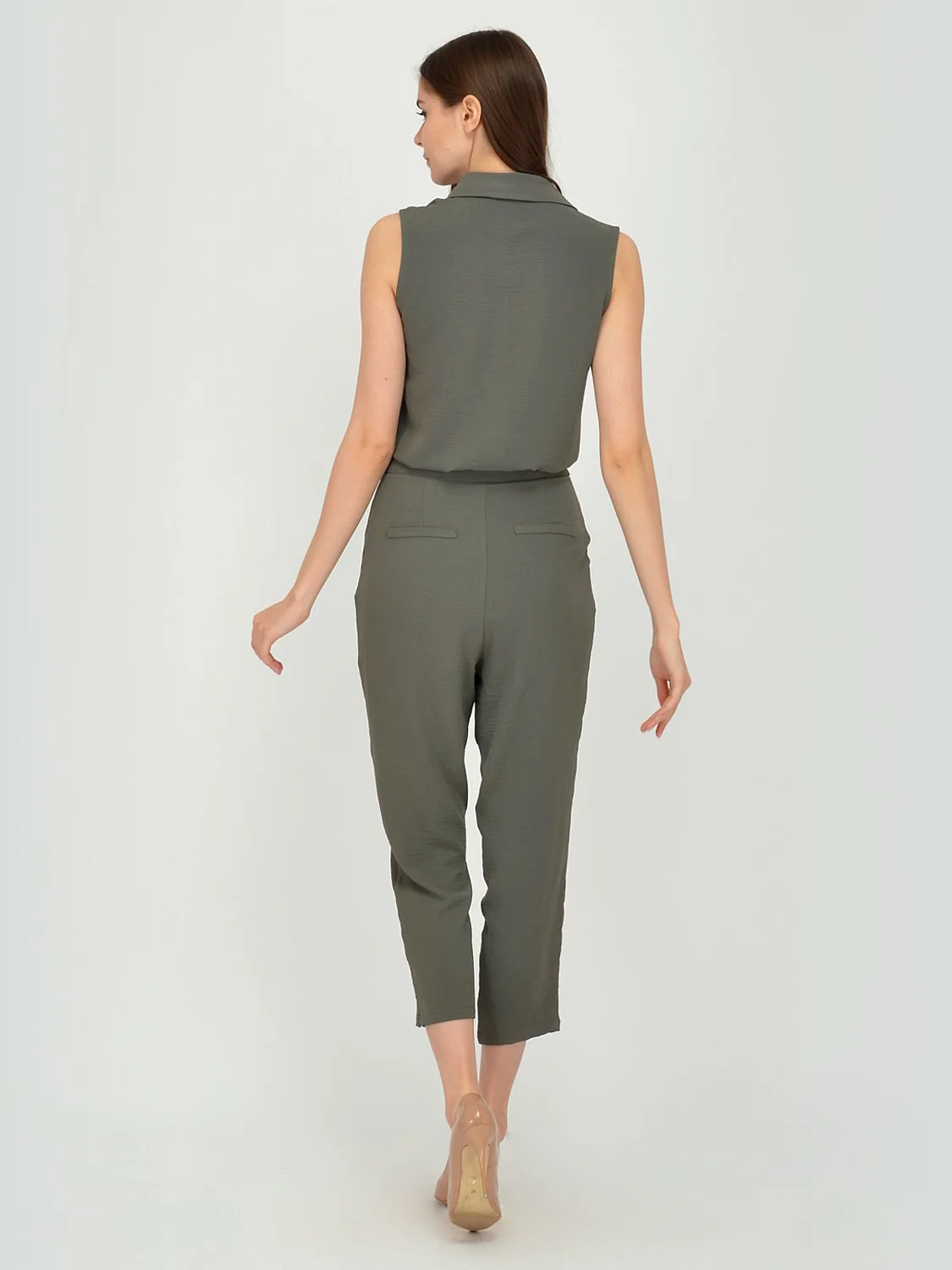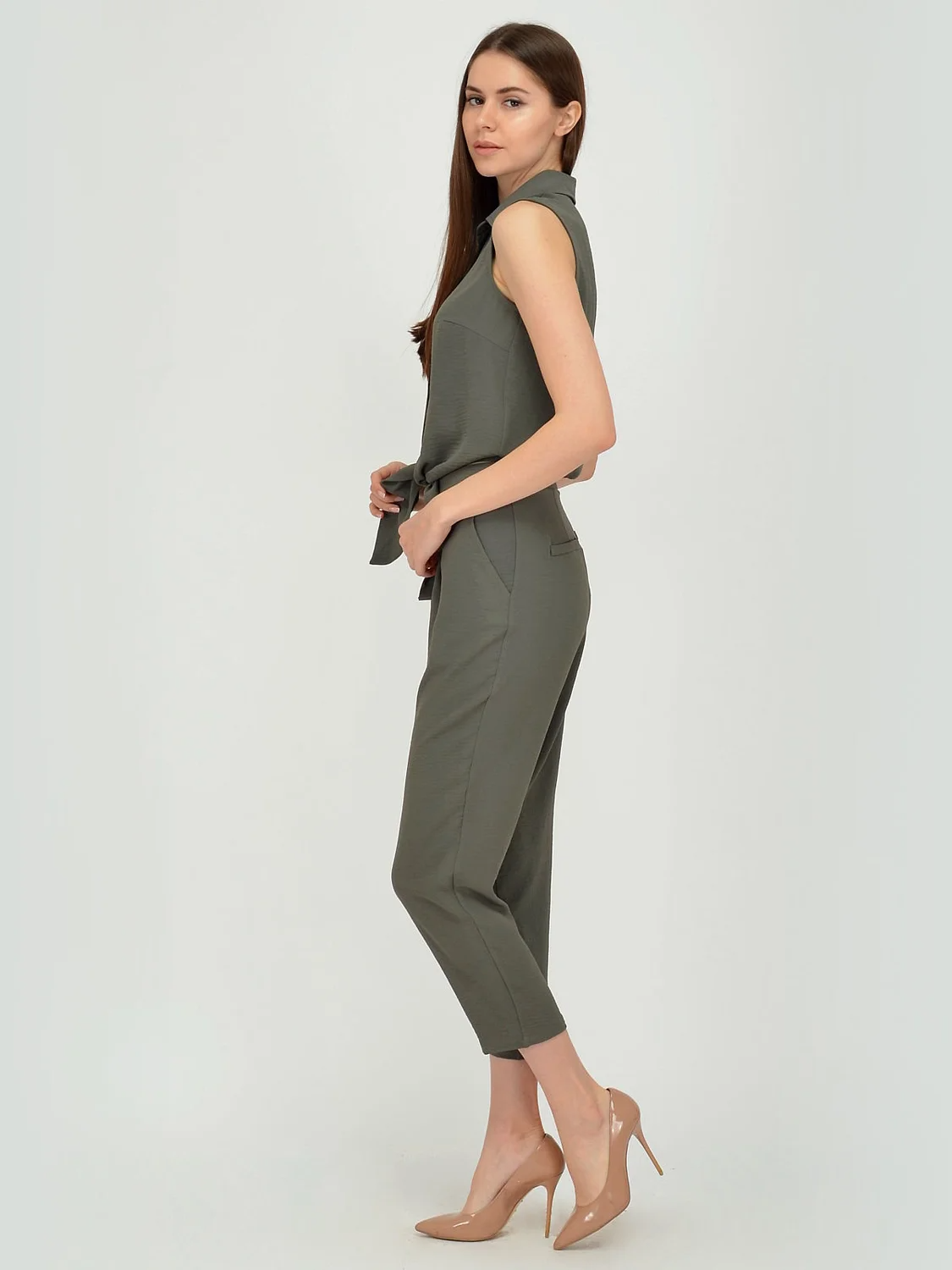 Комбинезон женский без рукавов. Застежка на пуговицы. Брюки укороченные, зауженные на втачном поясе.В боковых швах втачные карманы. Передние полочки переходят в узел.