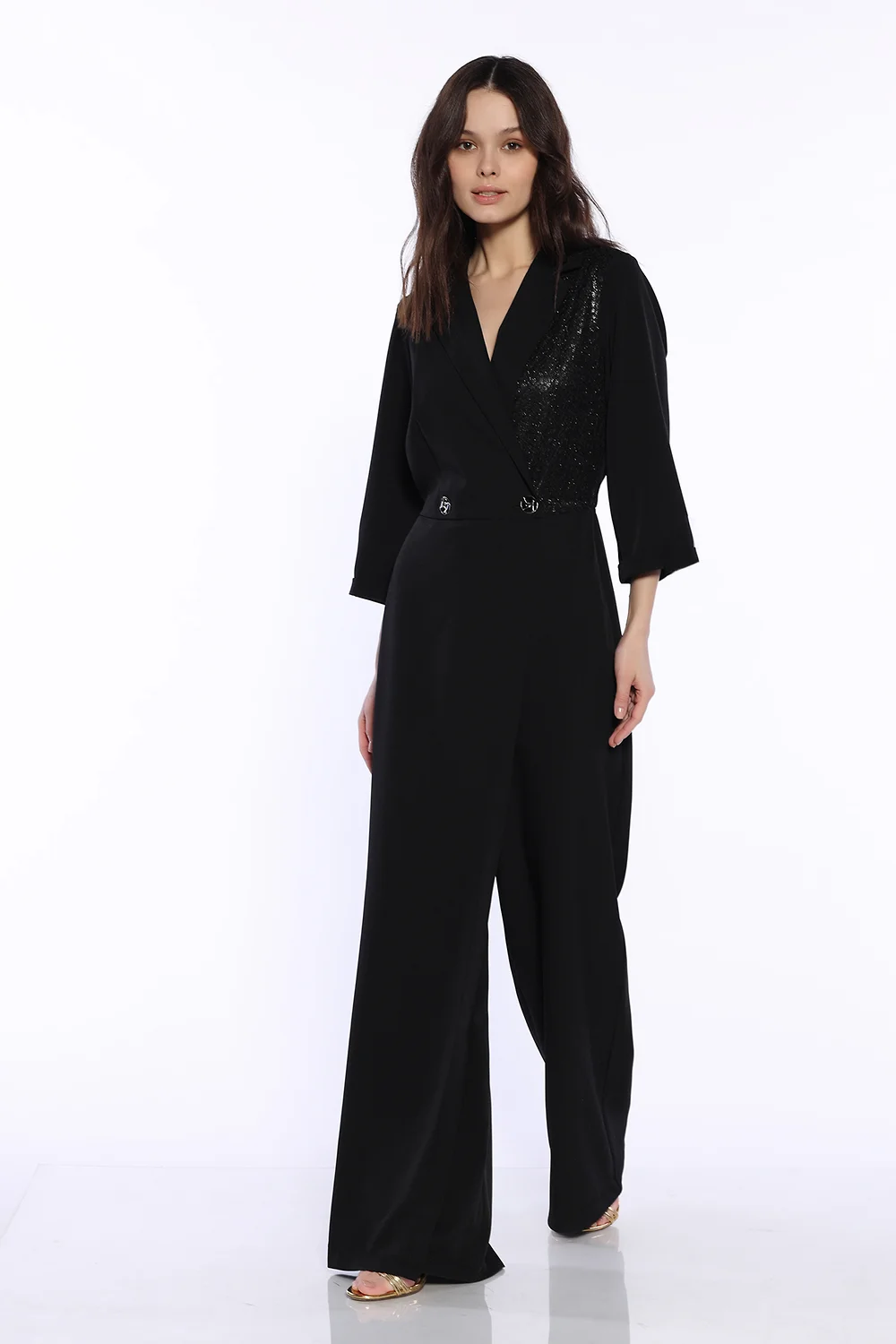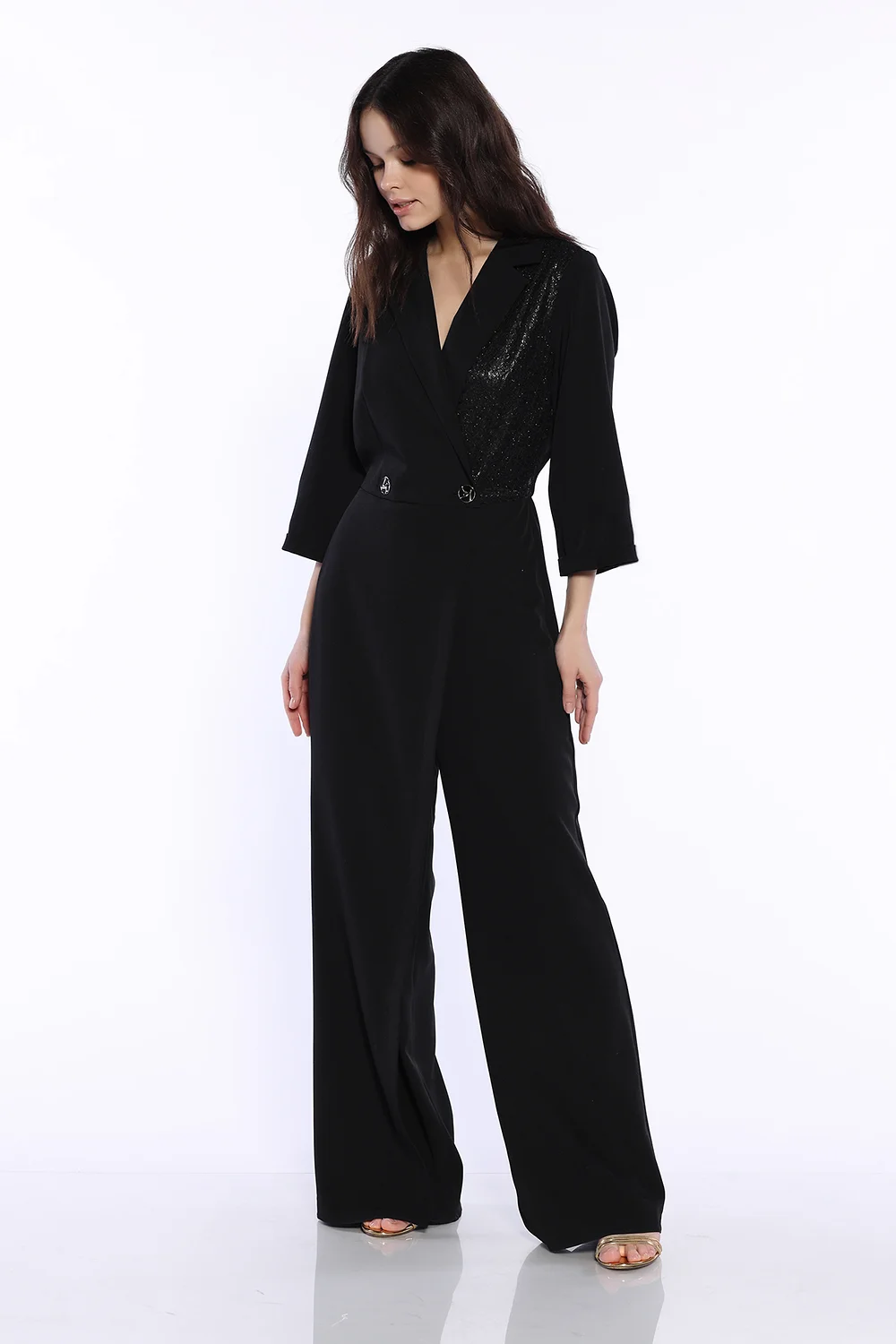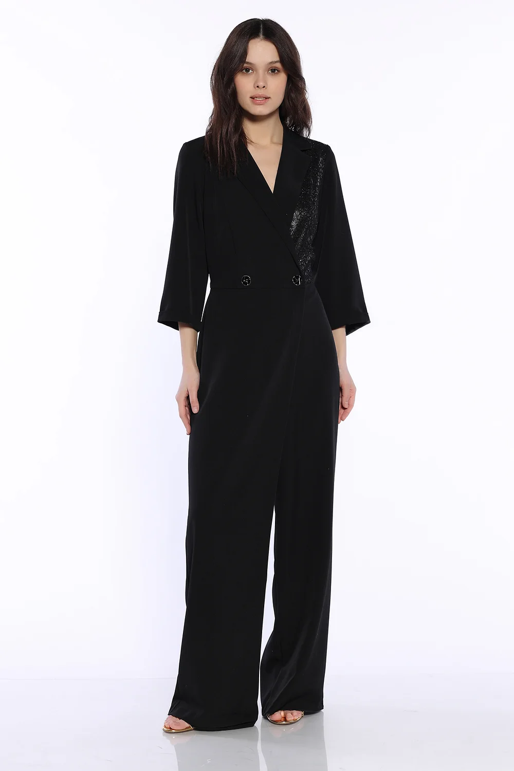 Стильный брючный комбинезон это тренд последних сезонов, который будет уместно смотреться на различных праздниках и торжественных мероприятиях. Комбинезон имеет классический отложной воротник и широкие брюки с завышенной посадкой, имитируя комплект жакета с брюками. Комбинезон имеет застежку пуговицы, которые имеют эффектный дизайн. Половина полочки оформлена блестящей вставкой, придавая образу торжественности. На передней части комбинезона находится декоративный нахлест, запах. Рукава комбинезона свободные длины три четверти, поэтому Вы будете чувствовать себя комфортно и уверенно. Шикарный брючный комбинезон станет изысканной новинкой в Вашем гардеробе, позволяя Вам всегда быть на высоте. Темный цвет, широкие брюки палаццо и акцентированная талия смоделируют женственный силуэт, скрывая возможные недостатки фигуры и подчеркивая ее достоинства. Элегантный женский комбинезон выпускается в широком размерном ряду. И взрослые женщины, и молодые девушки и подростки будут центром внимания в подобном образе. Завершите вечерний ансамбль обувью на высоком ходу, броскими украшениями и аксессуарами.