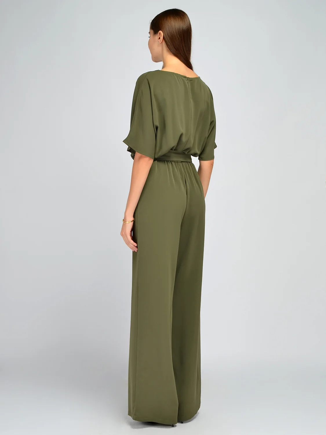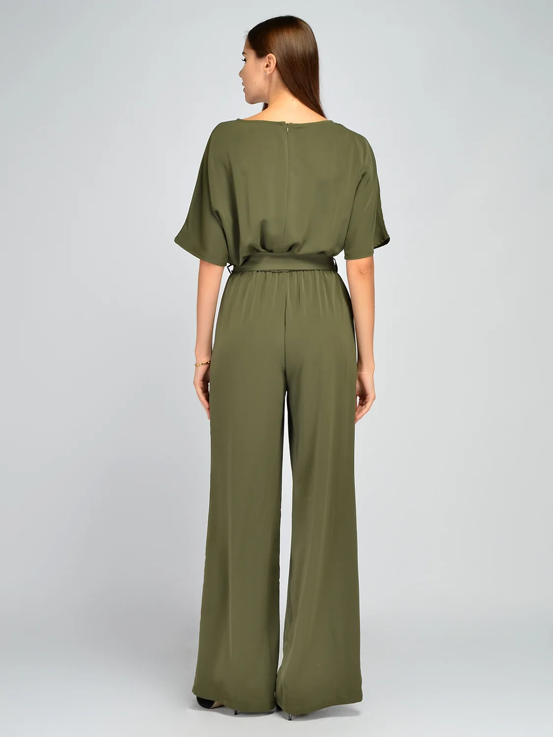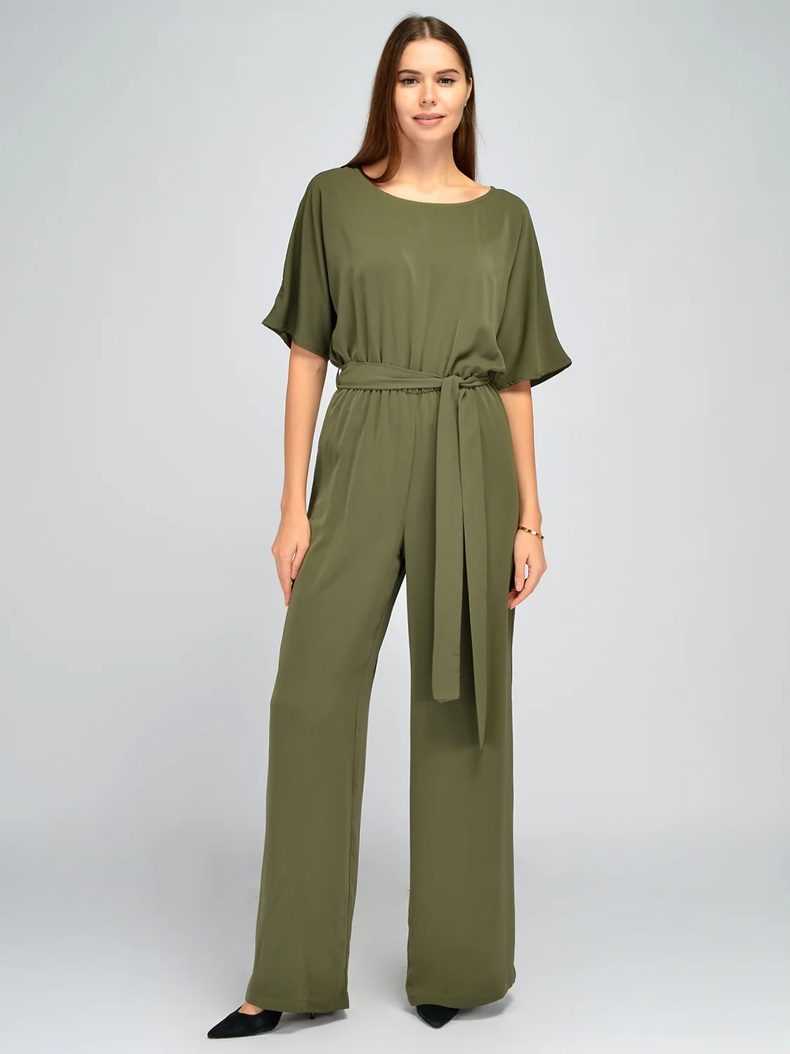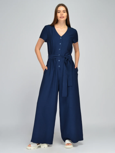 Брючный комбинезон свободного кроя станет находкой для любой модницы. Изящный вырез горловины лодочка не давит на шею, приоткрывает ключицу, добавляя легкости и женственности. Свободные рукава до локтя обеспечат свободу движений, поэтому Вы будете чувствовать себя раскованно и уверенно за праздничным столом или на танцполе. По линии тали проходит удобная резинка, которая моделирует утонченный силуэт и гармоничные пропорции фигуры. Резинка скрыта комплектным поясом в цвет изделия, дополнительно акцентируя внимание на талии. Застегивается модель на потайную молнию на спине. Благодаря широкому фасону комбез не облегает фигуру, не акцентирует внимание на ее нюансах, а, наоборот, подчеркивает ее достоинства. Модель выполнена в актуальных расцветках, в которых Ваш образ будет стильным и притягательным. Комбез с длинными брюками идеально подойдет высоким девушкам. Лаконичный комбинезон с поясом будет уместно смотреться в офисе, на торжественных и культурных мероприятиях. Дополните образ подходящими украшениями, аксессуарами и обувью.