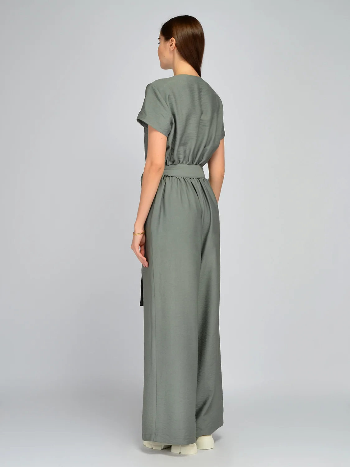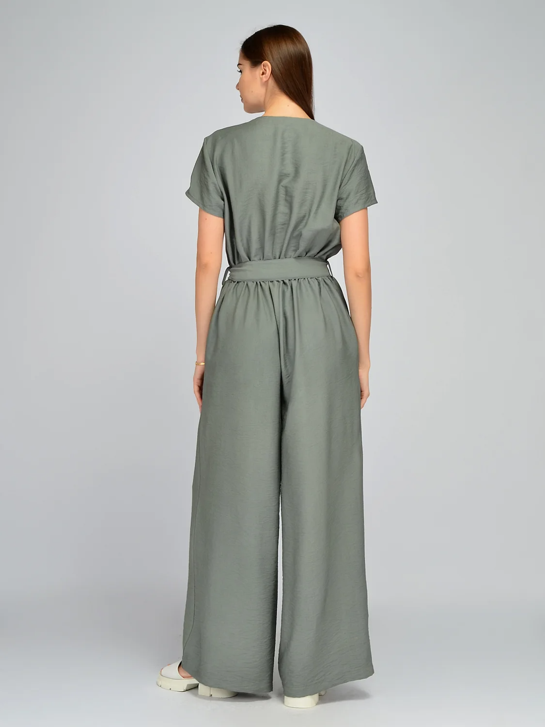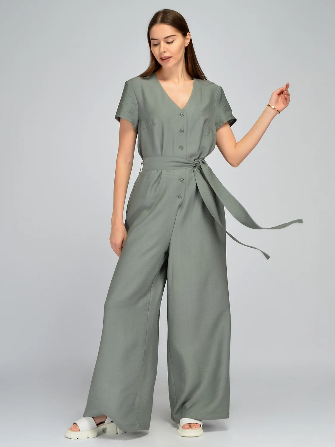 Летний брючный комбинезон станет прекрасной обновкой для Вашего летнего гардероба. Изящный V-образный вырез горловины визуально удлиняет линию шеи, добавляя женственности. Классические короткие рукава не облегают руки, оставляя свободу движениям и позволяя носить комбез на работу и деловые встречи, не оголяя плеч. Застегивается свободный летний комбинезон на пуговицы спереди. В поясе находятся шлевки, и комбез комплектуется длинным поясом. Вы можете подчеркнуть талию им или использовать любой ремешок на свое усмотрение. Длинные брюки в пол красиво струятся при ходьбе, придавая Вашей походке легкости и уверенности. Комбинезон выполнен из приятной тонкой ткани, которая в жаркую погоду будет немного холодить кожу и дарить ощущение комфорта даже в жаркие дни. Широкий крой комбеза с акцентом на талии подойдет на любую фигуру, поскольку будет подчеркивать ее достоинства и скрывать несовершенства. Базовую вещь можно носить как на повседневной основе, так и на культурные или праздничные мероприятия, обыграв образ яркими украшениями и обувью.