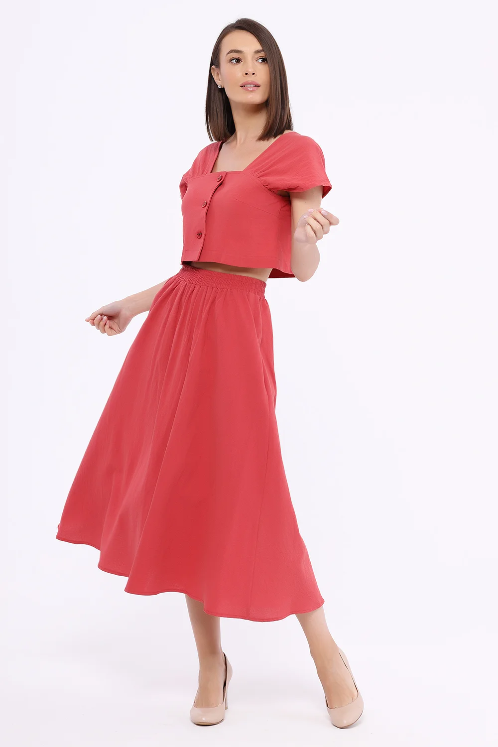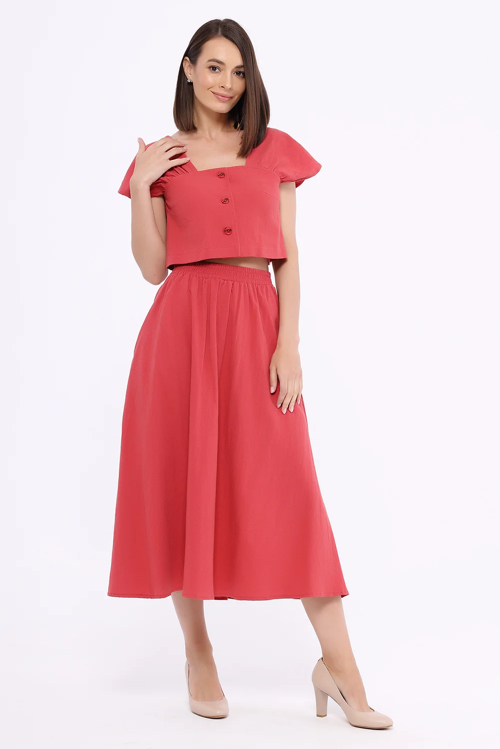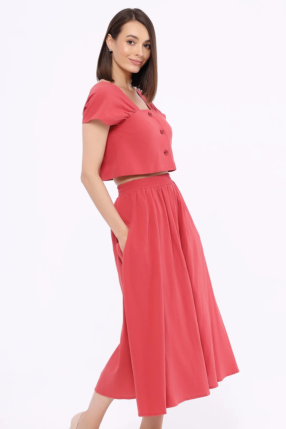 Романтичный летний комплект из топа и юбки миди обязательно найдёт место в летнем гардеробе современной девушки. Укороченный топ подчеркивает линию талии. У топа интересный фигурный вырез спереди и сзади, а также короткие свободные рукава. В широкой юбке миди с завышенной талией и карманами Вы будете чувствовать себя легко и женственно.