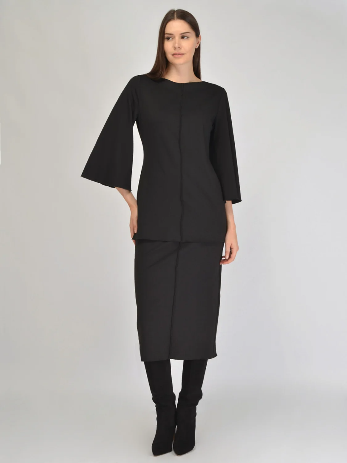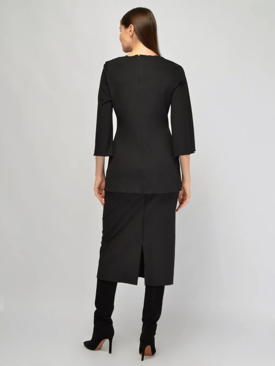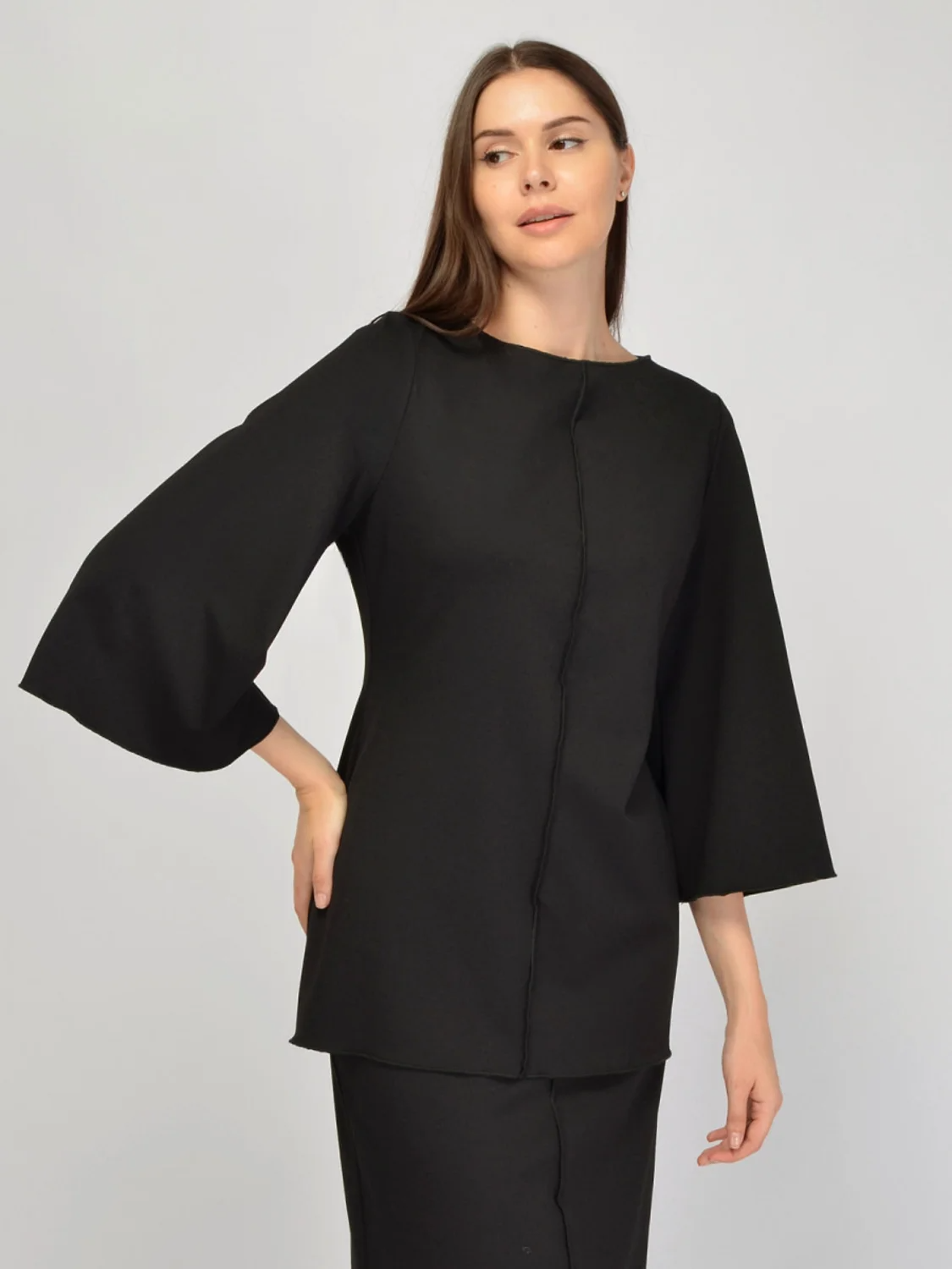Длинная трикотажная блузка станет важным элементом классических образов, которые заиграют новыми красками. Первое, что бросается в глаза – эффектные широкие расклешенные рукава при приталенном силуэте модели. Такое дизайнерское решение придает оригинальности всему образу, который захочется рассматривать. Края изделия обработаны декоративным швом с нитками в тон, благодаря чему блузка смотрится богаче и интереснее. Вырез горловины лодочка добавляет женственности и не давит на шею. Длина осенней блузка в сочетании с вертикальным швом на полочке визуально вытягивает силуэт и добавляет несколько сантиметров росту. Застегивается блузка на потайную молнию на спинке. Плотная трикотажная ткань практически не мнется и сохранит опрятный вид на протяжении всего дня. Приталенная блузка с рукавами клеш идеально сочетается с комплектной юбкой карандаш миди из нашей коллекции. Удлиненную тунику можно носить как на работу в офис, так и на деловые встречи или на культурные или праздничные мероприятия.