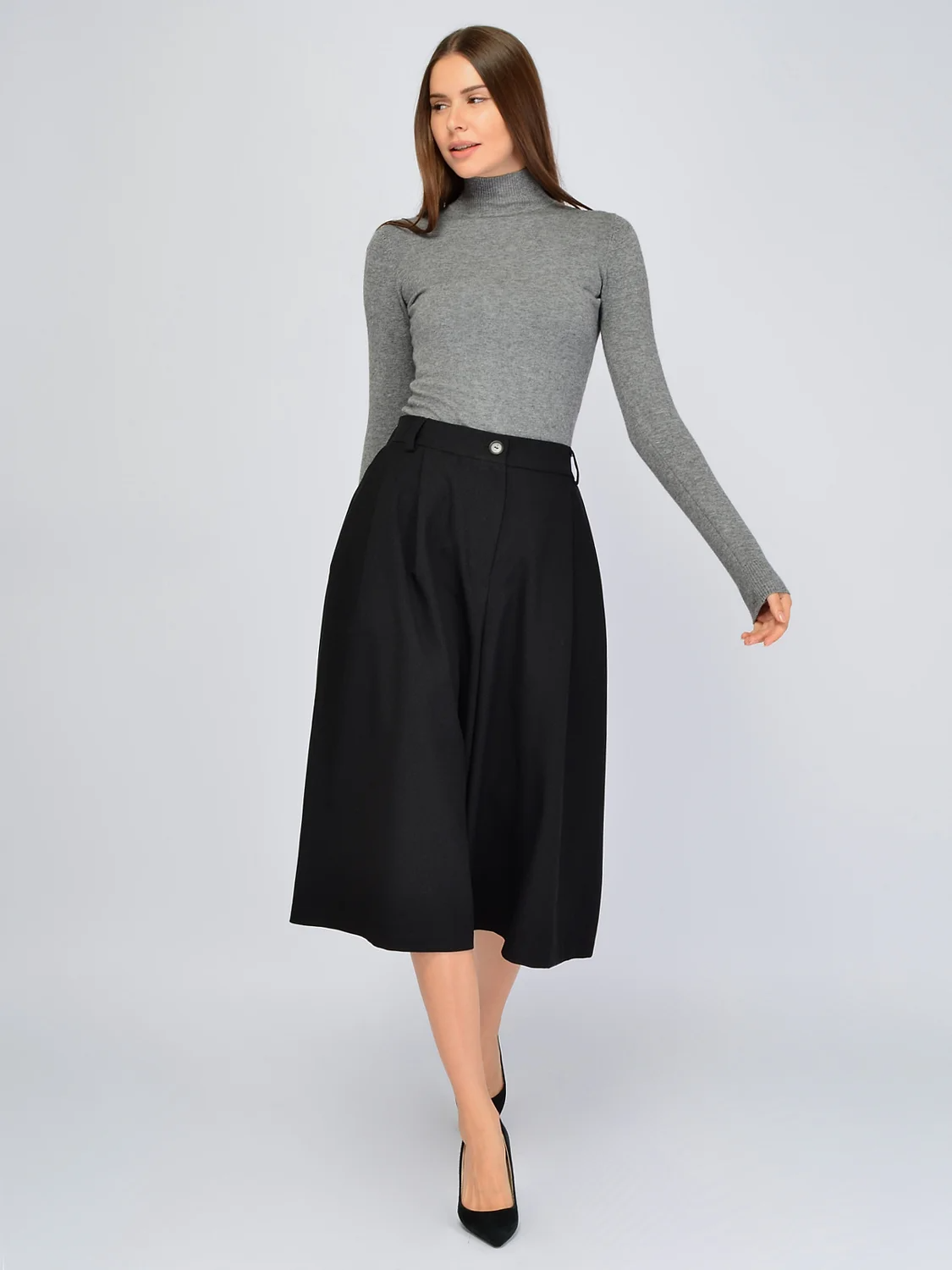 Свободные кюлоты это актуальный элемент гардероба, который придется по вкусу тем, кто предпочитает классический и при этом современный стиль в одежде. Высокая посадка создает гармоничные пропорции фигуры, не укорачивая рост. По задней части пояса проходит резинка, обеспечивая правильную посадку на талии. Застегивается модель на пуговицу и молнию. Укороченные брюки оснащены карманами по бокам для удобства современных девушек. Спереди на изделии находятся декоративные складки, благодаря которым кюлоты изящно струятся при ходьбе и сохраняют широкую форму. Базовые брюки ниже колена не облегают бедра и помогут скрыть возможные недостатки фигуры. Трендовая модель впишется не только в классические строгие образы, но и в повседневные городские, обеспечивая максимальный комфорт и не стесняя движений. Модные свободные кюлоты идеально сочетаются с комплектным жилетом из нашей коллекции, а также с различными блузками, рубашками, водолазками. Обувь желательно выбирать на высоком ходу, чтобы подчеркнуть длину Ваших ног