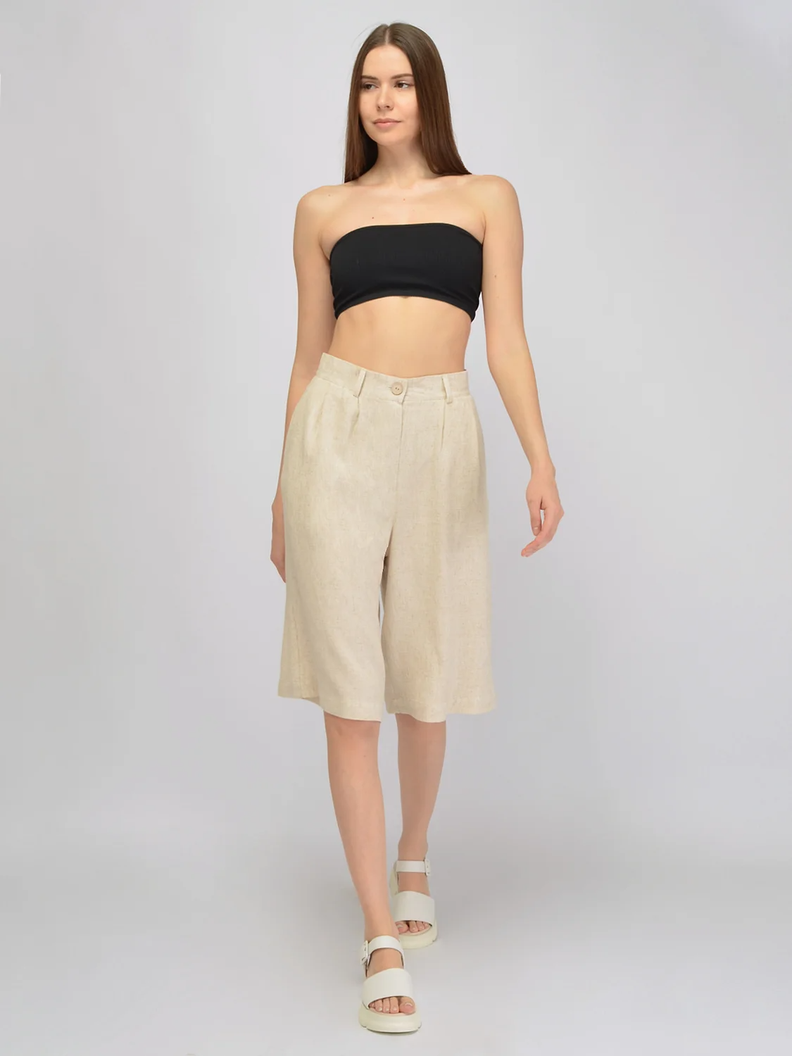 Свободные шорты ниже колена это трендовый элемент гардероба, который придется по вкусу тем, кто предпочитает совмещать стиль и комфорт в одежде. Широкие шорты в классическом стиле выполнены из 100% вискозы, которая позволит коже дышать даже в самый жаркий день. Высокая посадка создает гармоничные пропорции фигуры, добавляет несколько сантиметров росту. Застегиваются кюлоты на молнию и пуговицу, а в поясе находятся шлевки, в которые следует вставить ремешок. Укороченные брюки оснащены карманами по бокам для удобства современных девушек. Спереди на изделии находятся декоративные складки, благодаря которым кюлоты изящно струятся при ходьбе и сохраняют широкую форму. Базовые брюки ниже колена не облегают бедра и помогут скрыть возможные недостатки фигуры. Длинные летние шорты впишутся не только в классические строгие образы, но и в повседневные городские, обеспечивая максимальный комфорт и не стесняя движений. Модные свободные кюлоты идеально сочетаются с комплектной рубашкой из нашей коллекции, а также с различными футболками и топами.