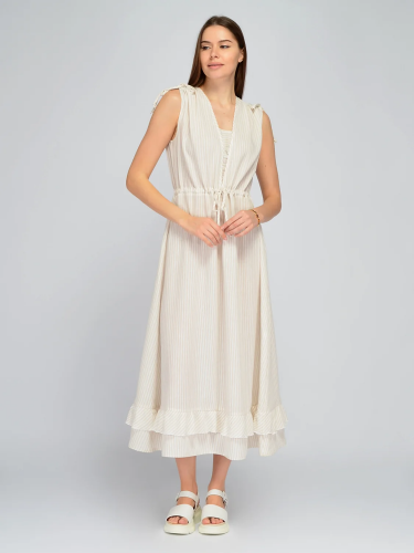 . Без отделки горловины. Без рукавов. Вид застёжки - завязки. Вырез горловины - округлый. Длина мини. Крой - расклешенный книзу. Покрой - трапеция. Без карманов. Рекомендована стирка при температуре не более 30С.