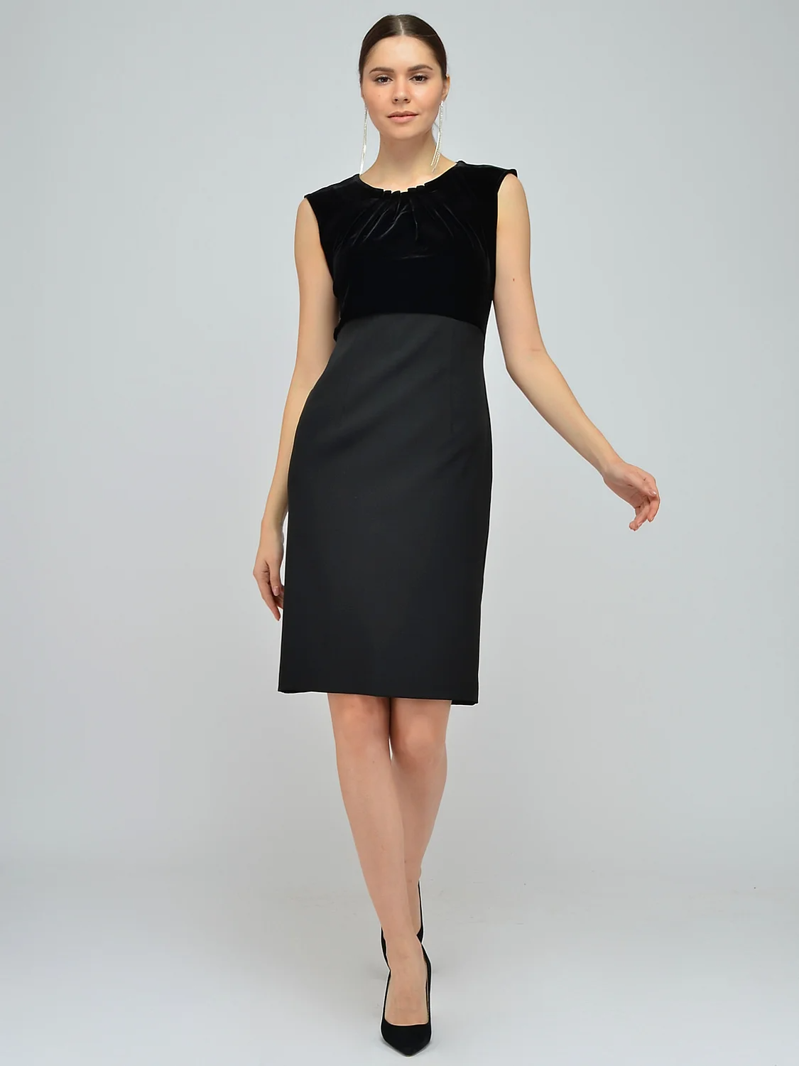 Платье мини скомбинировано из двух частей. Верхняя часть выполнена из бархата и дополнена складками по горловине. Утонченный вырез и короткий рукав придают образу женственности. Нижняя часть представлена в виде юбки карандаша с завышенной талией, что визуально удлиняет линию ног. Это платье идеально подходит для вечерних мероприятий.