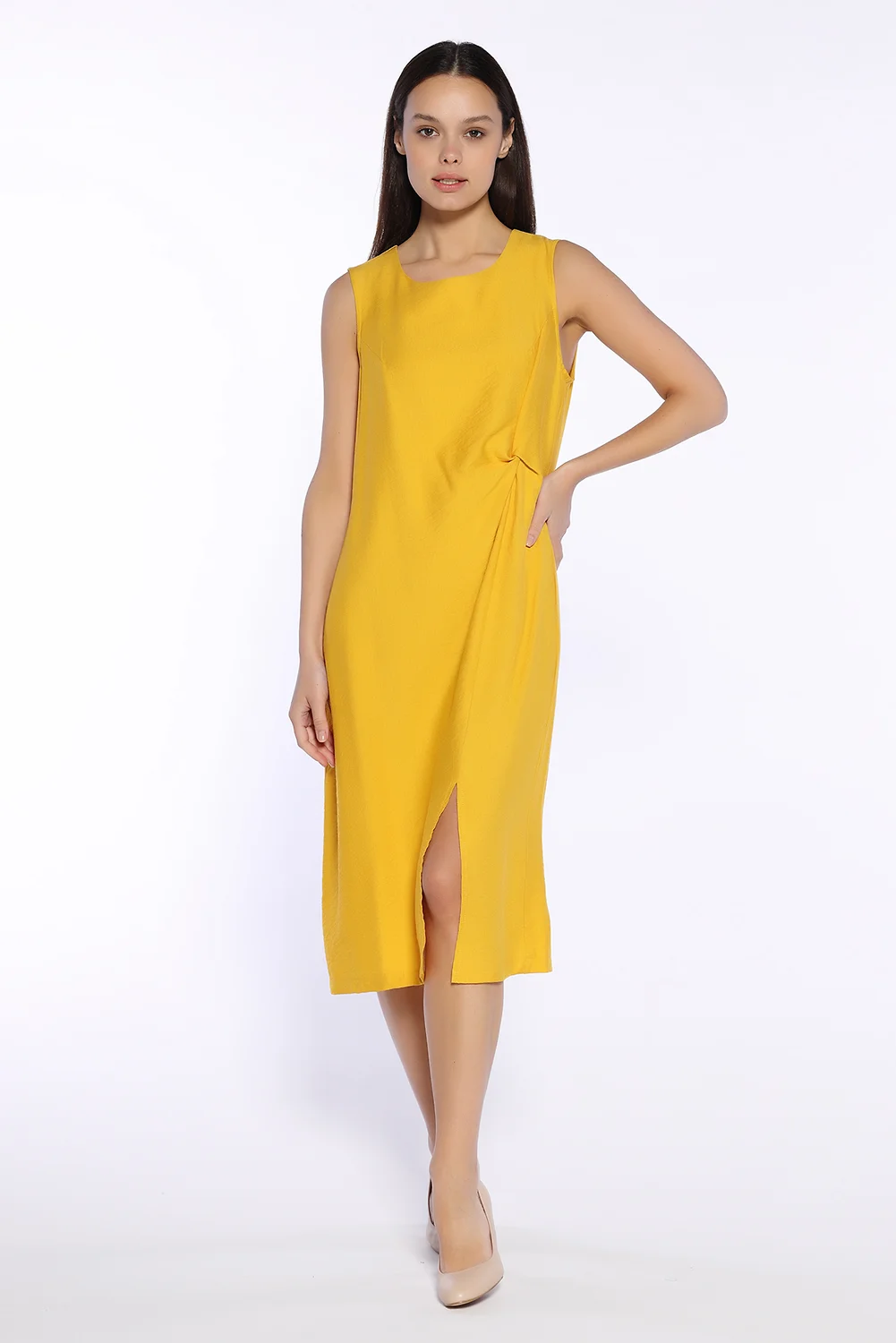 Лёгкое платье миди с разрезом создано для летнего гардероба современной девушки. Лаконичный силуэт, округлый вырез горловины, декоративная складка на линии талии и эффектный разрез на передней части платья создают элегантный и женственный образ. В составе платья хлопок, что позволит Вам чувствовать себя комфортно даже в жаркую погоду. Длина миди подходит любому типу фигуры. Вырез горловины - круглый. Без отделки горловины. Без рукава. Без застёжки. Декоративные элементы - разрез, складка на талии. Длина миди. Крой прямой. Покрой приталенный. Без карманов. Рекомендована стирка при температуре не более 30С.