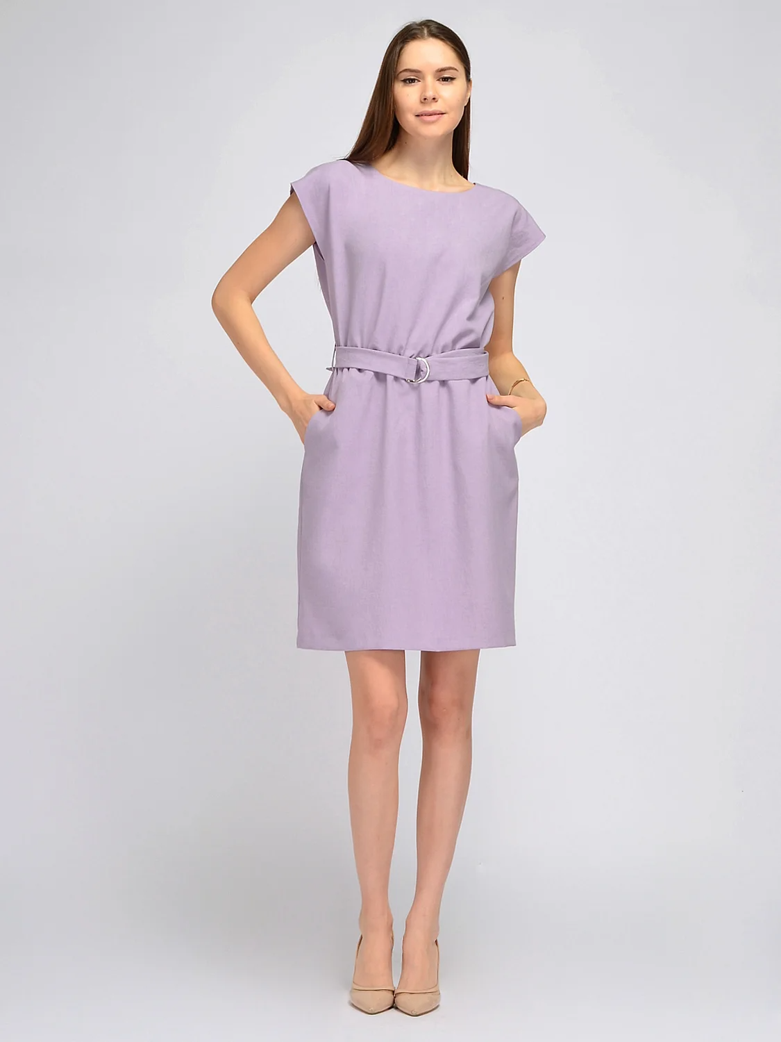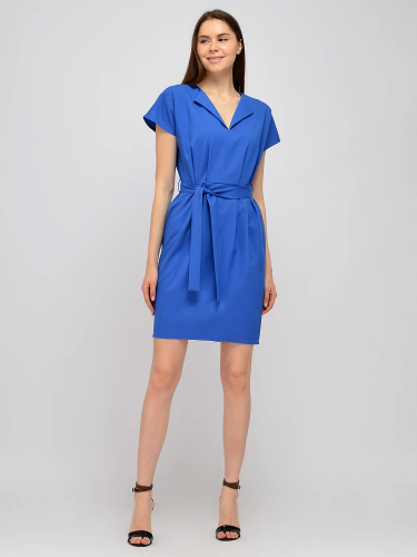 В составе платья полиэстер 50%, вискоза 50%. Вырез горловины - круглый. Рукав короткий. Комплектация - пояс. Без застёжки. Длина - миди. Крой расклешенный к низу. Модель платья - приталенное. Карманы втачные. Рукав цельнокроеный. Длина миди. Рекомендована стирка при температуре не более 30С.