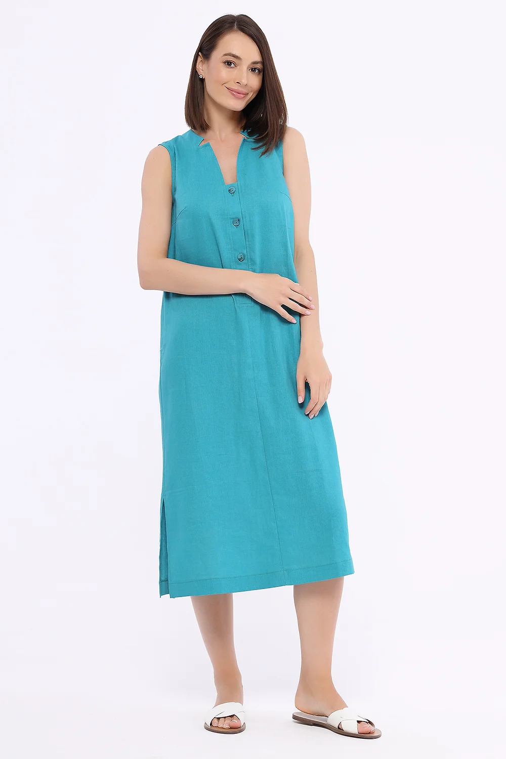 Прямое платье миди без рукавов - идеальная модель для лета. В составе платья лён, благодаря которому Вы будете чувствовать себя максимально комфортно в жаркое время года. Лаконичный фасон дополнен изысканным фигурным воротником, притягивающим взгляды. Платье застёгивается на пуговицы, расположенные на передней части платья. По бокам платья миди снизу располагаются небольшие декоративные разрезы.