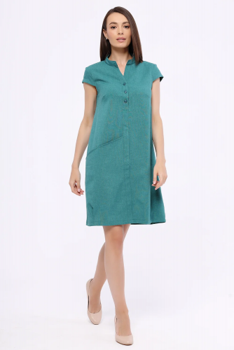 В составе платья вискоза 70%, лён 30%. Вырез горловины - фигурный. Без рукава. Вид застёжки - пуговицы. Декоративный элемент - разрез. Длина миди. Крой прямой. Без карманов. Рекомендована стирка при температуре не более 30С.
