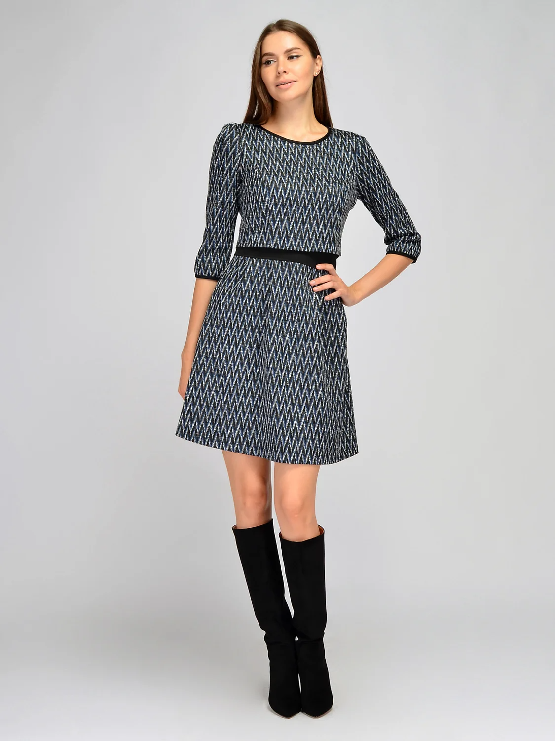 Платье миди с втачанным поясом. Приталенное платье необычного кроя с втачанным поясом станет незаменимым элементом Вашего стиля. Платье отрезное по линии талии, что создаёт эффект раздельного комплекта: блузки и юбки. Лаконичный дизайн платья имеет округлый вырез горловины и женственный укороченный рукав 3/4. Свободный крой юбки в складку позволит Вам чувствовать себя комфортно в любых условиях. В составе платья полиэстер 70%,вискоза 25%,лайкра 5%. Вырез горловины круглый, рукав укороченный 3/4, вид застёжки - молния, длина миди, крой приталенный, юбка в складку, без карманов, втачной пояс, отрезное по линии талии, рукав три четверти, отлетная спинка и полочка. Рекомендована стирка при температуре не более 30С.Практичную расцветку платья дополните яркими аксессуарами и подходящей обувью. Платье миди приталенного кроя не имеет привязки к сезону. В тёплое время года завершите образ легкой обувью и интересными украшениями, а в холодную пору Вам будет удобно в плотных колготках, ботинках, а сверху можно накинуть палантин или кардиган.