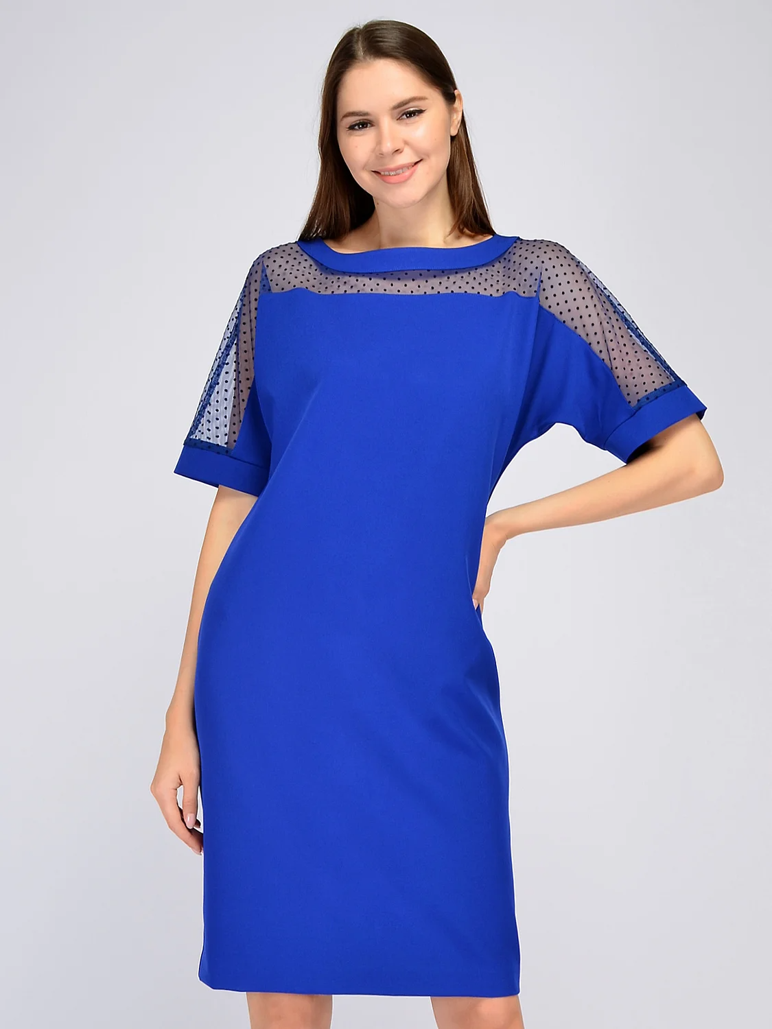 Вечернее платье с короткими рукавами.Если Вы подбираете вечернее платье для праздничного мероприятия, присмотритесь к платью миди прямого кроя с коротким рукавом. Платье декорировано эффектной сеткой для придания образу женственности. Деликатные округлый вырез оформлен материалом, из которого выполнено платье. Вырез горловины круглый. Без отделки горловины. Рукава короткие. Рукава цельнокроеные. Форма рукава широкий. Вид застежки молния. Декоративный элемент сетка. Длина миди. Крой прямой. Конструктивный элемент разрез. Без карманов. Рекомендована стирка при температуре 30С.Создайте яркий образ для торжественного мероприятия, дополнив платье миди прямого кроя элегантными туфлями на каблуке, акцентными аксессуарами и высокой прической. Если станет прохладно, накиньте на плечи палантин или удлинённый жакет.