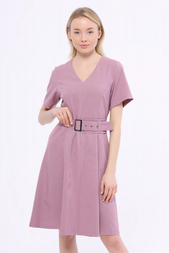 В составе платья полиэстер 50%, вискоза 50%. Вид горловины - V-образный вырез, рукав короткий, рукав втачной, в комплекте пояс, вид застёжки - молния сзади, длина миди, крой приталенный, без карманов. Рекомендована стирка при температуре не более 30С.