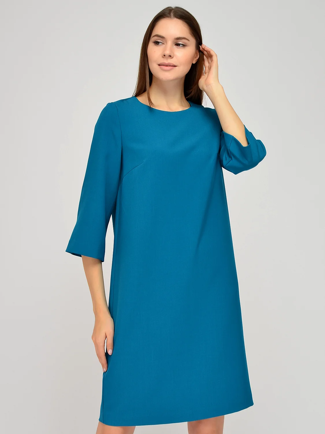 Платье миди прямого кроя.Трикотажное платье миди прямого силуэта прекрасно подойдёт для повседневного стиля или для делового образа. Изящный округлый вырез горловины подчеркивает шею и ключицу. Широкие рукава три четверти элегантно приоткрывают руки и придают свободы движениям. Универсальное платье выгодно подчеркивает достоинства фигуры и скрывает ее недостатки. Вырез горловины - круглый. Длина рукава - до локтя. Рукава втачные. Форма рукавов - широкие. Вид застёжки - молния. Декоративный элемент - разрез. Длина миди. Крой прямой. Без карманов. Рекомендована стирка при температуре не более 30С.Чтобы завершить образ для офиса, сочетайте платье миди с жакетом, строгой обувью и лаконичными уркашениями, а для завершения повседневного стиля, наденьте сверху кардиган, обувь на низком ходу и возьмите с собой крупную сумку. В любом образе Вы будете выглядеть стильно и гармонично.