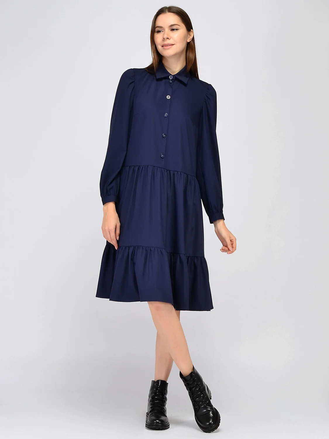 Платье миди с отложным воротником.Универсальное платье миди на пуговицах идеально подойдет и для офиса, и для торжественного мероприятия, и для похода в театр. Классический отложной воротник придает образу строгости, а свободная двухуровневая юбка, соединенная горизонтальными строчками добавит легкости и женственности. Комфортные длинные рукава со складками на плечах обеспечат свободу движениям. Вырез горловины округлый. Отделка горловины отложной воротник. Рукава длинные. Рукава втачные. Вид застежки пуговицы. Длина миди. Конструктивный элемент волан. Крой прямой. Покрой свободный. Без карманов. Рекомендована стирка при t не более 30С.Элегантное платье миди гармонично дополнит и строгий, и городской образ, а также образ на выход. Подбирайте обувь и аксессуары исходя из повода. К платью свободного покроя подойдет обувь и на высоком, и на низком ходу, лаконичные и крупные украшения, небольшие сумки через плечо или шопперы.