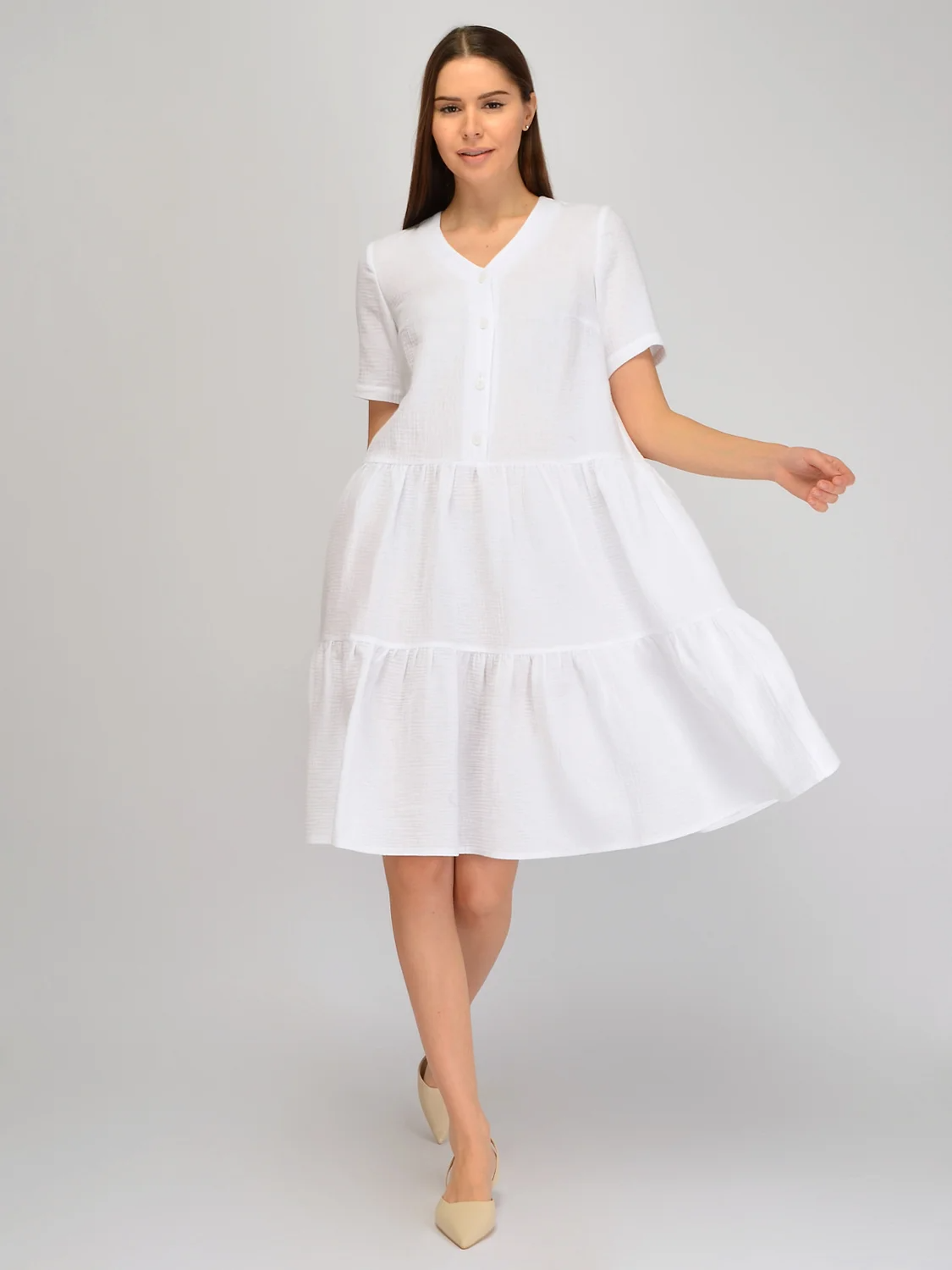 Хлопковое платье свободного кроя станет Вашим любимым выбором в жаркий сезон. Деликатный V-образный вырез горловины красиво обрамляет линию шеи. Удобные короткие рукава не давят на руки и обеспечивают свободу движений. Застегивается широкое платье на ряд пуговиц до талии. Прямой фасон однотонного платья не облегает фигуру и поможет скрыть возможные ее нюансы. Двухъярусная юбка с оборками изящно струится при ходьбе, придавая Вашей походке легкость и женственность. Летнее платье до колена выполнено из 100% жатого хлопка, а это значит, что Вы будете чувствовать себя комфортно на протяжении всего дня, даже в знойную погоду. Платье трапеция имеет вытачки на груди, поэтому такая модель прекрасно сядет на любые формы, подчеркивая Вашу естественную красоту. Вы можете подчеркнуть талию, дополнив легкое платье миди ремешком. Повседневное платье с юбкой колокол подойдет для работы в офисе, прогулки, пляжного отдыха и для активных занятий на свежем воздухе. Благодаря широкому крою сарафан с коротким рукавом по достоинству оценят будущие мамы на разных сроках!