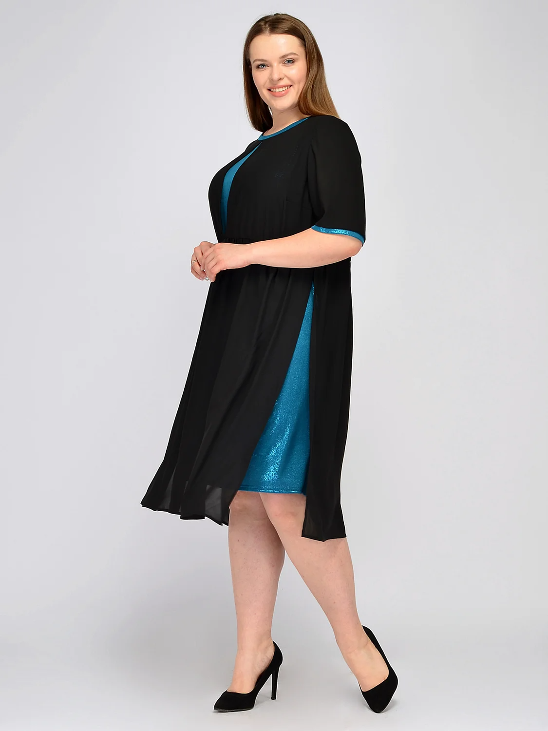 Вечернее платье миди с контрастными элементами. Выбирая платье для вечернего мероприятия, обратите внимание на прямое платье миди с укороченными рукавами до локтя. Контрастное обрамление воротника, рукавов и декоративная вставка на передней части платья добавляют ярких притягательных акцентов Вашему образу. Вырез горловины круглый. без отделки горловины. Рукава короткие. Без застежки. Без воротника. Длина миди. Комплектация с нижним платьем. Конструктивный элемент разрез. Крой прямой. Покрой свободный. Рукава втачные. Детали одежды люрекс. Рекомендована стирка при температуре не более 30С. Свободный покрой праздничного платья дополнен строчкой на талии, визуально делая Ваш силуэт похожим на форму песочных часов. Завершите торжественный образ ярким браслетом, обувью на высоком ходу и вечерней прической.