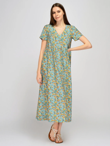 Платье макси с коротким рукавом. Базовое платье макси с коротким рукавом добавит Вашему летнему гардеробу романтичного настроения. Деликатный вырез подчеркивает ключицу, а длина макси изящно приоткроет щиколотку. На линии талии проложена аккуратная строчка, которая визуально сужает талию и создает правильные пропорции тела. Широкий крой платья обеспечит непревзойдённое ощущение комфорта и свободы в жаркое время года. V образный вырез. Без отделки горловины. Рукава короткие. Рукава втачные. Без застежки. Декоративный элемент драпировка. Длина макси. Крой широкий. Без карманов. Рекомендована стирка при температуре не более 30С. Наденьте платье макси с коротким рукавом на работу, на прогулку или на свидание. Свободный фасон платья, дополненный обувью на высоком ходу, придаст Вашему образу легкости и женственности. Подберите к платью небольшую сумочку через плечо и летние аксессуары.