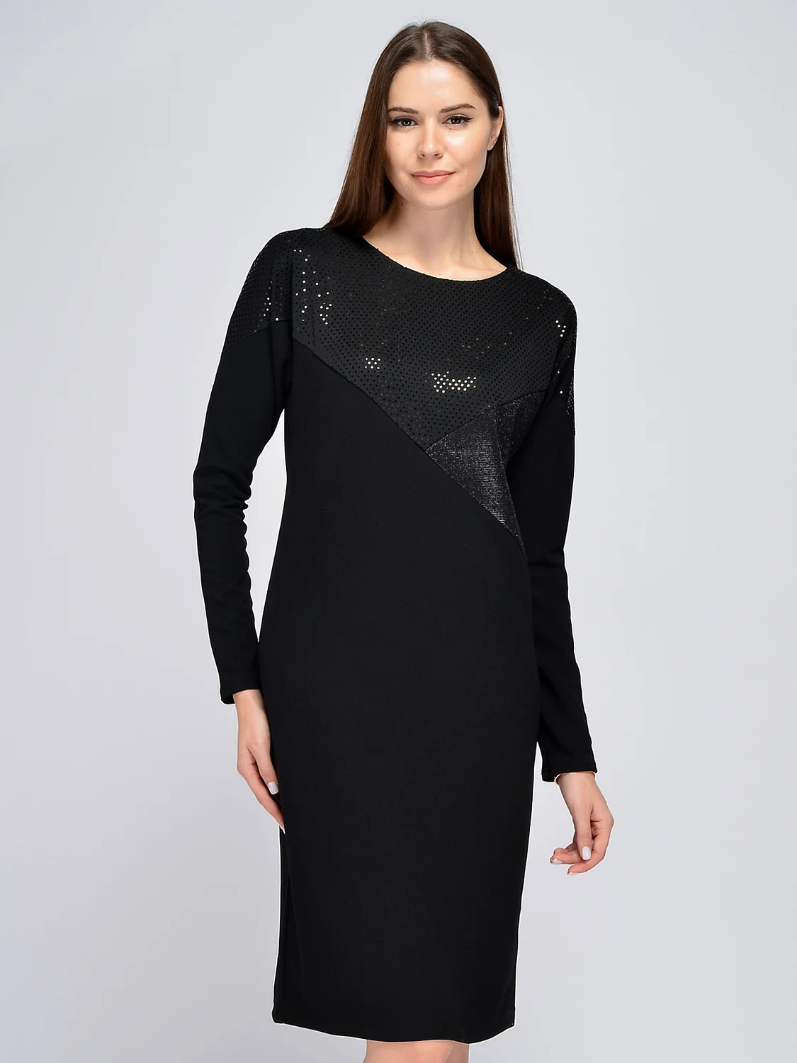 Праздничное платье миди с интересными декоративными деталями порадует свою обладательницу. Эффектное платье до колен имеет блестящую асимметричную отделку на полочке. Полуприлегающий приталенный крой подчеркнет достоинства фигуры. Платье имеет аккуратный округлый вырез горловины, немного приоткрывая ключицу. Закрытое лаконичное платье подойдет как взрослым женщинам, так и молодым девушкам. Нарядное платье с длинными рукавами станет интересным решением для праздников и торжеств: на Новый год, свадьбу, день рождения, юбилей. Элегантное вечернее платье выпускается в широком размерном ряду, в наличии большие размеры плюс сайз plus size. Стильное платье миди имеет цельнокроеный рукав формы летучая мышь. Завершите торжественный образ яркими украшениями, аккуратными аксессуарами и классической обувью: туфлями, сапожками, ботильонами. Почувствуйте себя женственно и уверенно в новогодней новинке!