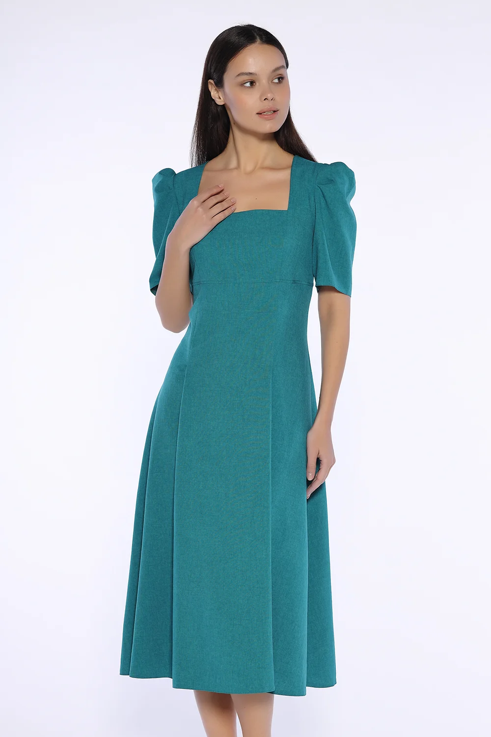 Летнее платье миди приталенного силуэта станет важной новинкой Вашего гардероба. Миди платье с расклешенной юбкой обеспечит Вам элегантный и женственный образ на каждый день или для особых случаев. Длинное летнее платье имеет стильный квадратный вырез горловины, придавая образу интеллигентности. Под грудью находится декоративная горизонтальная отстрочка, привлекающая внимание к зоне декольте. Чтобы платье миди идеально сидело фигуре, на нем предусмотрены вытачки. Оригинальной деталью платья являются объемные рукава чуть выше локтя. Спереди и сзади на юбке находятся складки, моделирующие силуэт. Свободный крой юбки скроет возможные недостатки фигуры. Лаконичный фасон с эффектными элементами составит строгий и в то же время игривый образ. Вы можете надеть летнее платье ниже колена в офис, на свидание, на торжественное мероприятие, на свадьбу. Универсальное платье придется по вкусу как взрослым женщинам, так и молодым девушкам. Завершите образ украшениями и обувью на каблуке (лодочками или босоножками).