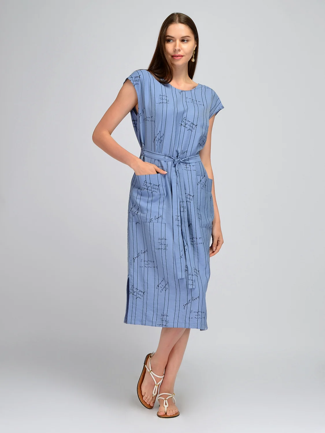 Лаконичное платье миди с короткими рукавами создаст удобный и женственный образ в летний сезон. Изящная округлая горловина приоткрывает ключицу и позволяет дополнить образ шейными украшениями. Короткие цельнокроеные рукава обеспечивают свободу движений. На платье предусмотрены вытачки на груди, поэтому модель прекрасно сядет на разные типы фигуры. Свободное платье комплектуется поясом в цвет, акцентируя внимание на талии и моделируя утонченный силуэт. На полочке располагаются накладные карманы, придавая образу практичности и удобства. По бокам находятся достаточно высокие разрезы, придавая легкости Вашей походке. Прямой крой платья поможет скрыть возможные недостатки фигуры, а пояс и вытачки подчеркнут ее достоинства. Летнее платье выполнено из приятного легкого материала, в основе состава вискоза, а это значит, что Вы будете чувствовать себя комфортно и уверенно на протяжении всего даже самого жаркого дня. Классический фасон может стать частью как офисного, так и повседневного или нарядного стиля. Завершенный образ будет зависеть от подобранной обуви, украшений и аксессуаров. Базовое платье придется по вкусу взрослым женщинам, молодым девушкам и будущим мамам.