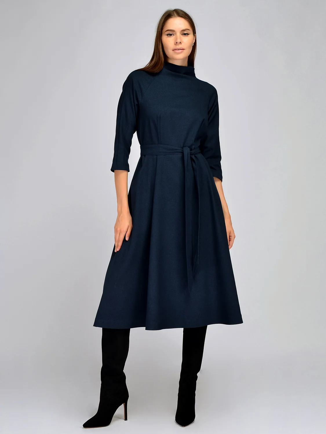 Осеннее платье миди прекрасно впишется в гардероб модниц, которые хотят выглядеть элегантно и стильно в прохладный сезон. Изящный воротник стойка придает образу сдержанности и придает уюта. Аккуратные рукава три четверти покроя реглан не сковывают движений и немного облегчают силуэт. В комплекте с платьем идет длинный пояс в цвет, который, завязываясь на талии, моделирует утонченные пропорции фигуры, визуально делая ноги длиннее. По бокам расположены функциональные карманы для смартфона, ключей или других полезных мелочей. А силуэт с расклешенной юбкой ниже колена не облегает фигуру и помогает скрыть лишние сантиметры на бедрах. Классическое длинное платье в базовых расцветках станет важной частью офисного и делового гардероба, а также будет прекрасно смотреться на различных праздниках и торжественных мероприятиях. Дополните образы строгой обувью (туфлями, сапогами или ботильонами), лаконичными украшениями и аксессуарами. Создавай удобные и притягательные образы с однотонным платьем миди!