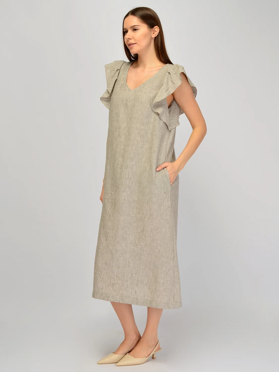 Длинное летнее платье поможет создать комфортный и женственный образ в жаркий сезон. Прямой крой и длина макси скроют возможные недостатки фигуры и при этом позволят Вашей коже дышать. Элегантный V-образный вырез горловины подчеркнет шею и ключицу и добавит романтичности. Особого шарма свободному платью макси придают короткие рукава с рюшами, которые будут эффектно развеваться при движении. Легкий сарафан в пол оснащен удобными карманами по бокам. Платье из вискозы имеет изящные завязки и вырез на спине. Летний сарафан с открытой спиной подойдет для прогулок по городу, пикника и пляжного отдыха на море. Просторный фасон по достоинству оценят будущие мамы и женщины плюс сайз. Тонкое платье макси с принтом имеет широкую пройму, позволяя Вам чувствовать себя комфортно и не стесняя Вас в движениях. Удлиненное платье станет базой легких повседневных образов летом.