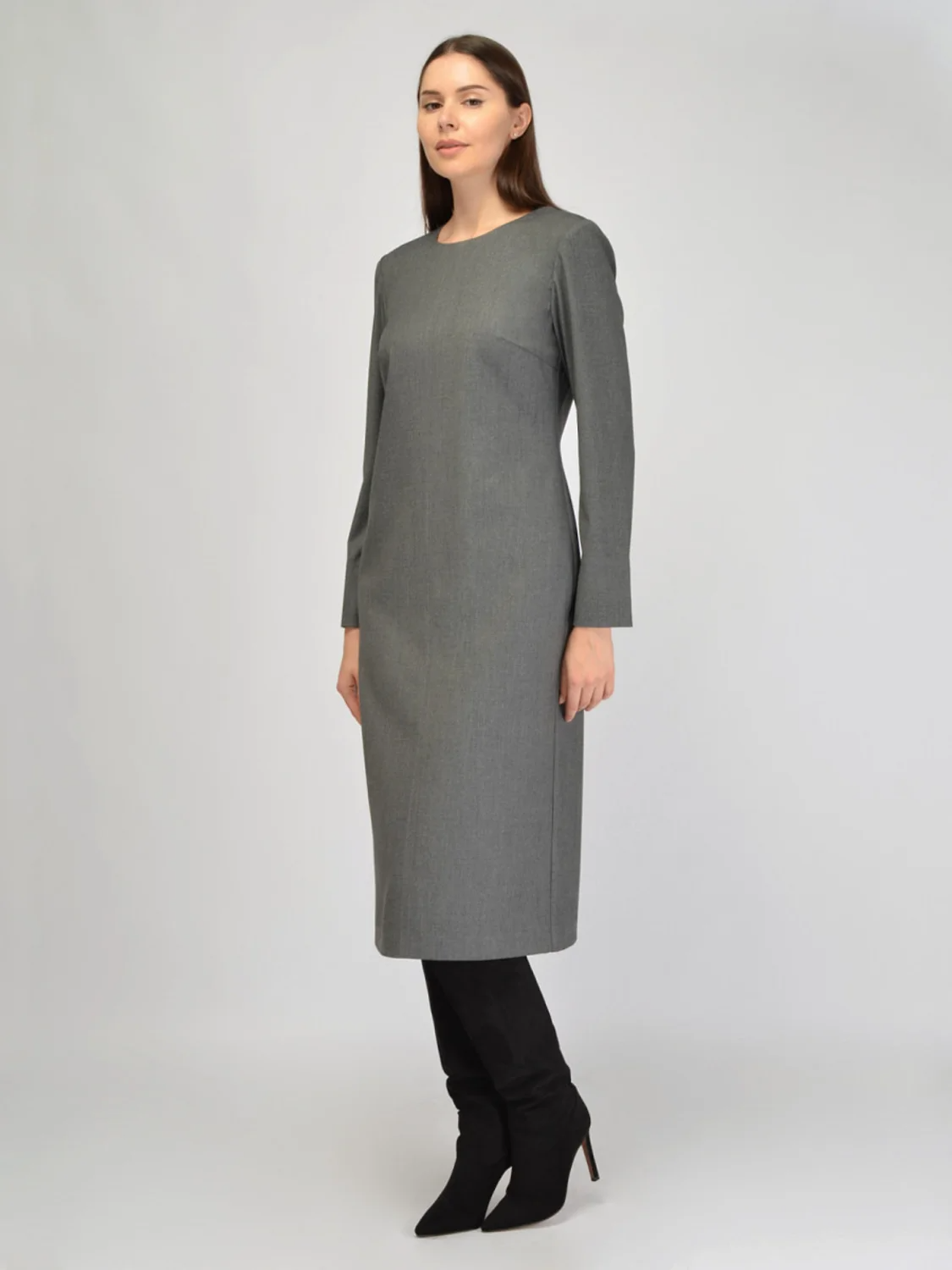 Осеннее платье футляр в строгом стиле дополнит Ваш гардероб для работы в офисе или культурных мероприятий. Приталенный фасон со свободным прилеганием в области бедер сформирует женственный силуэт, а благодаря вытачками на груди модель прекрасно сядет даже на пышные формы. Длинный, вмеру свободный рукав будет уместен в осенне-зимний период. Длинное платье миди имеет эффектный разрез сзади, что не только добавляет удобства при ходьбе, но и создает запоминающийся акцент. Классическое платье футляр выполнено из приятной плотной ткани с большим процентом вискозы в составе, что позволяет изделию выглядеть опрятно на протяжении всего дня, а также обеспечивает комфорт свой обладательнице. Вы можете создать стильный образ для деловой встречи, работы, праздника или культурного события, дополнив платье украшениями и аксессуарами, а также подберите обувь на высоком ходу. Прямое платье в базовых расцветках придется по вкусу молодым девушкам и взрослым женщинам, выбирающих строгий дресс код.