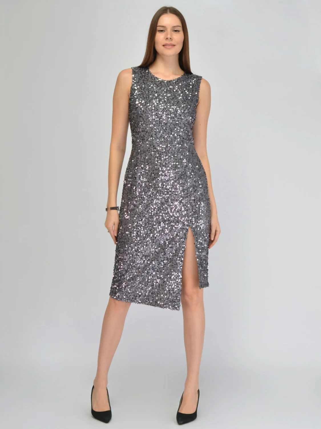 Эффектное платье с пайетками сделает Вас звездой любого мероприятия. Крой платья прост и элегантен. Округлый вырез горловины не давит на шею и позволяет добавить деликатное украшение. У платья миди нет рукавов, чтобы ничто не стесняло Ваших движений. Приталенный силуэт подчеркнет изгибы фигуры. Зато спереди располагается достаточно высокий стильный разрез по левой ноге. Это позволит Вам не только чувствовать легкость при ходьбе, но и визуально делает Ваши ноги длиннее. Асимметричный низ нарядного платья добавляет изюминку притягательному образу. Застегивается блестящее платье миди на потайную молнию на спине. Оригинальное и благородное платье впишется в торжественные образы для особых случаев, где Ваш блеск оценят по достоинству. Завершите яркий образ для вечеринки обувью на высоком ходу, чтобы выглядеть еще выше и стройнее.