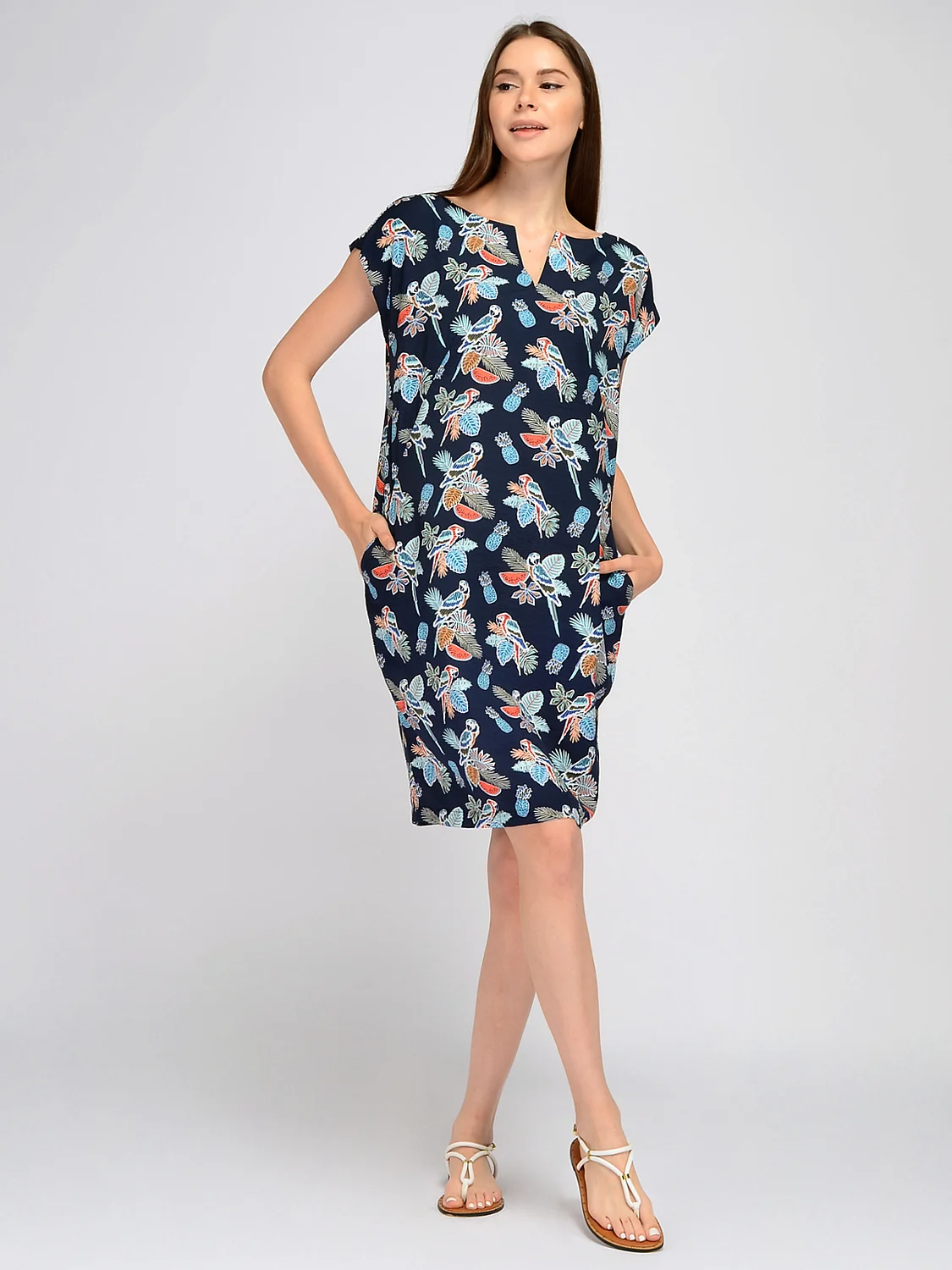 Прямое платье с коротким рукавом - идеальная модель на лето. Лаконичный дизайн платья миди дополнен яркими принтами. Изысканный фигурный вырез горловины подчеркнет красоту шеи и ключицы. На задней части платья располагается разрез, благодаря которому Вы будете чувствовать себя комфортно при ходьбе. Вырез горловины - фигурный. Рукав короткий. Без застёжки. Длина миди. Конструктивный элемент - разрез. Крой прямой. Рекомендована стирка при температуре не более 30С.