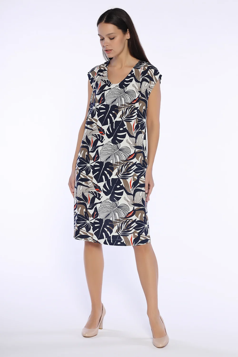 Прямое платье с коротким рукавом - идеальная модель на лето. Лаконичный дизайн платья миди дополнен яркими принтами. Изысканный фигурный вырез горловины подчеркнет красоту шеи и ключицы. На задней части платья располагается разрез, благодаря которому Вы будете чувствовать себя комфортно при ходьбе.Вырез горловины - фигурный. Рукав короткий. Без застёжки. Длина миди. Конструктивный элемент - разрез. Крой прямой. Рекомендована стирка при температуре не более 30С.
