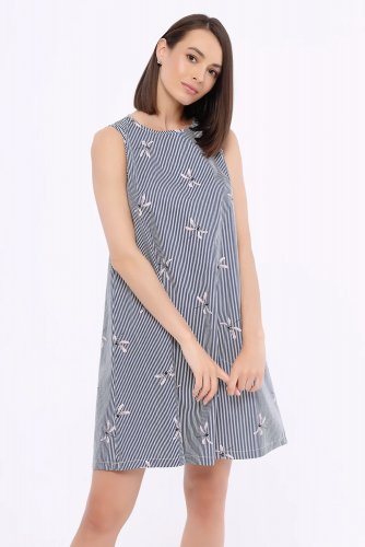 Платье женское без рукавов, отрезное по линии талии , клешеное.На спинке V-образный вырез Дополнено ремнем из ткани.