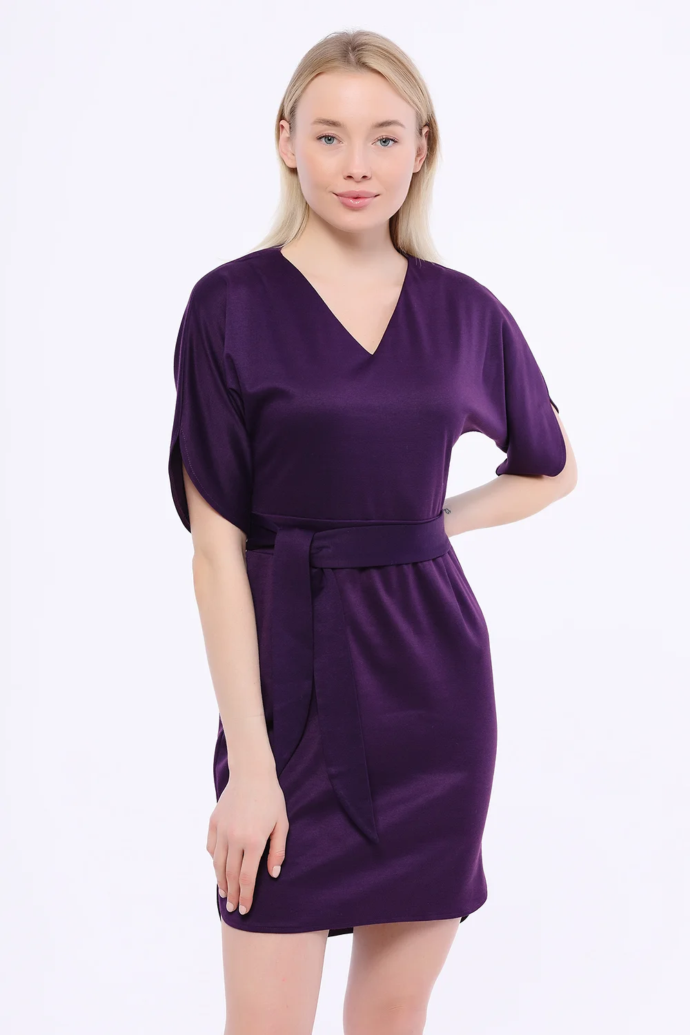 В составе платья хлопок полиэстер 70%, вискоза 25%, лайкра 5%. V-образный вырез. Без отделки горловины. Рукав короткий. Пояс в комплекте. Без застёжки. Рукав до локтя. Крой приталенный. Конструктивный элемент - разрез. Модель юбки - прямая. Без карманов. Форма рукава - летучая мышь. Длина мини. Рекомендована стирка при температуре не более 30С.