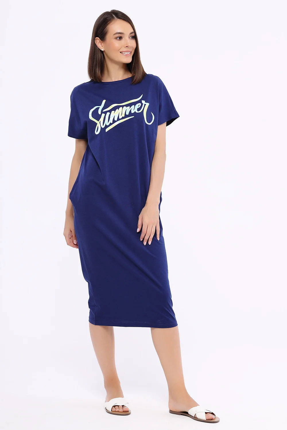 В составе платья хлопок 70%, полиэстер 30%. Рукав короткий. Тип рукава - цельнокроеный. Вырез горловины - округлый. Без застёжки. Декоративный элемент - принт. Длина миди. Покрой зауженный. Карманы в шве. Рекомендована стирка при температуре не более 30С.