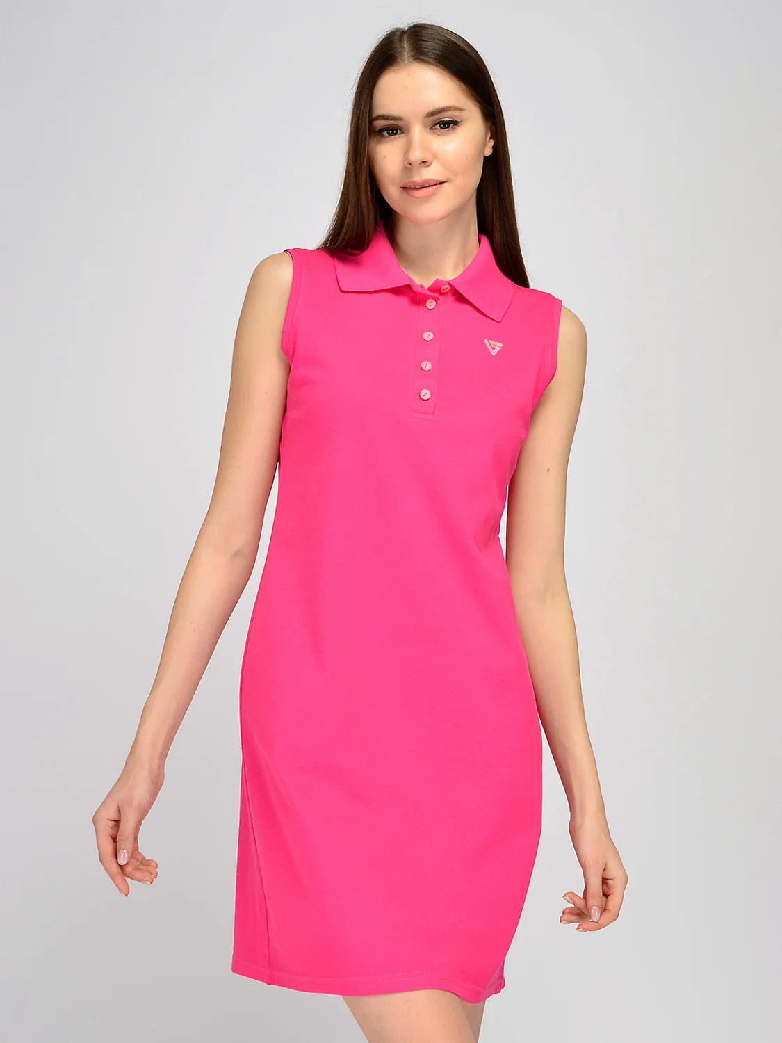 Платье поло без рукавов. Спортивное платье-поло без рукавов из коллекции Актив гармонично дополнит весенне-летний гардероб. Платье выполнено из 100 процентного хлопка, а значит, даже в жаркую погоду Вы будете чувствовать себя комфортно. Платье-поло в стиле кэжуал Вы с удовольствием будете носить в качестве образа для повседневного стиля или даже дома. Вырез горловины круглый. Отделка горловины воротник. Воротник отложной. Без рукава. Вид застежки пуговицы. Декоративный элемент логотип. Длина мини. Крой приталенный. Без карманов. Рекомендована стирка при температуре не более 30С. Платье-поло полуприлегающего силуэта - обязательный элемент активного образа жизни. Дополните платье мини кроссовками, кедами или босоножками, рюкзаком и собранными в хвост волосами. Фасон платья-поло без рукавов подарит ощущение свободы и уверенности. Завершите образ контрастными аксессуарами для придания ему индивидуальности.
