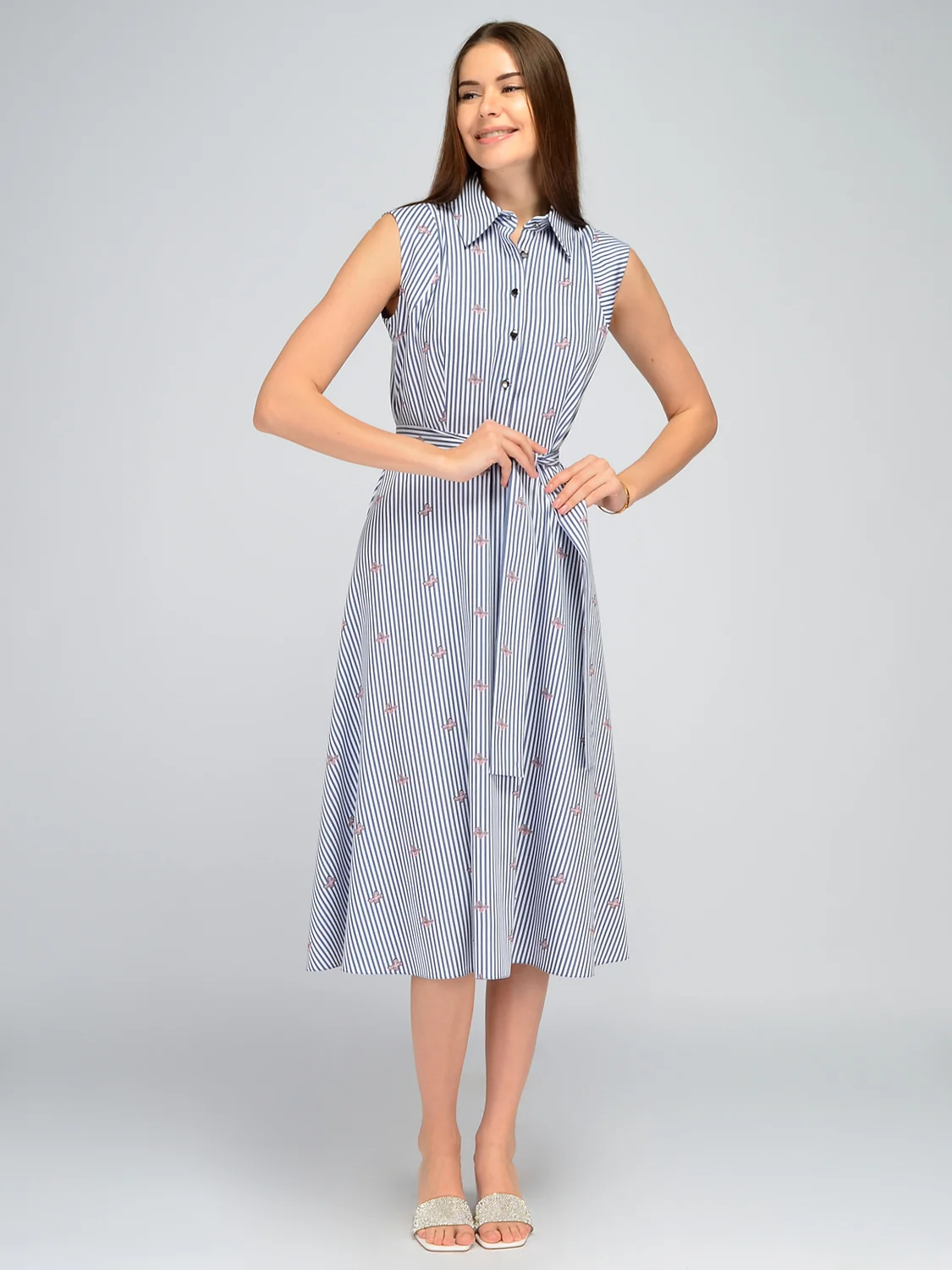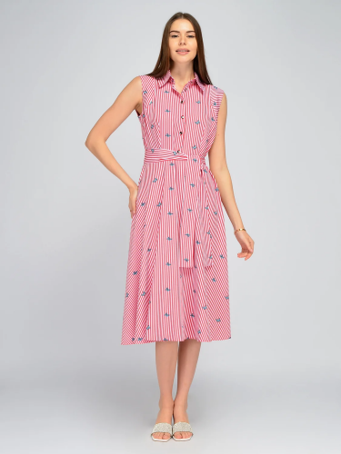Летнее платье миди без рукавов займет достойное место в гардеробе каждой модницы. Отложной воротник держит форму и придает некоторой строгости. Еще один конструктивный элемент платья – планка с пуговицами. При желании их можно застегнуть до конца или сделать вырез более открытым. Расклешенная юбка А силуэта помогает маскирует возможные нюансы в области бедер, а широкий комплектный пояс подчеркнет женственные формы, акцентируя внимание на талии. Нарядное легкое платье ниже колена станет универсальной вещью, поскольку его можно надеть и на работу в офис, и на деловую встречу, и на различные торжественные мероприятия, взять с собой в отпуск и надеть на романтическое свидание. Меняйте образ в зависимости от подобранных украшений, обуви и аксессуаров. Удлиненное платье миди прекрасно подойдет как высоким девушкам, так и дама небольшого роста. Вы можете подобрать к платью клеш обувь на каблуке или белые кеды. Струящийся сарафан без рукавов сделает Вашу походку легкой и воздушной!