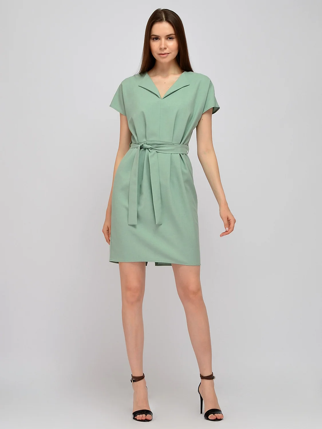 В составе платья хлопок 50%, полиэстер 50%. Вырез горловины - фигурный, округлый. Длина рукава - короткий. Рукав цельнокроеный. Без карманов. Комплектация - пояс. Вид застёжки - молния. Декоративный элемент - складки. Длина мини. Конструктивный элемент - разрез. Крой приталенный. Рекомендована стирка при температуре не более 30С.