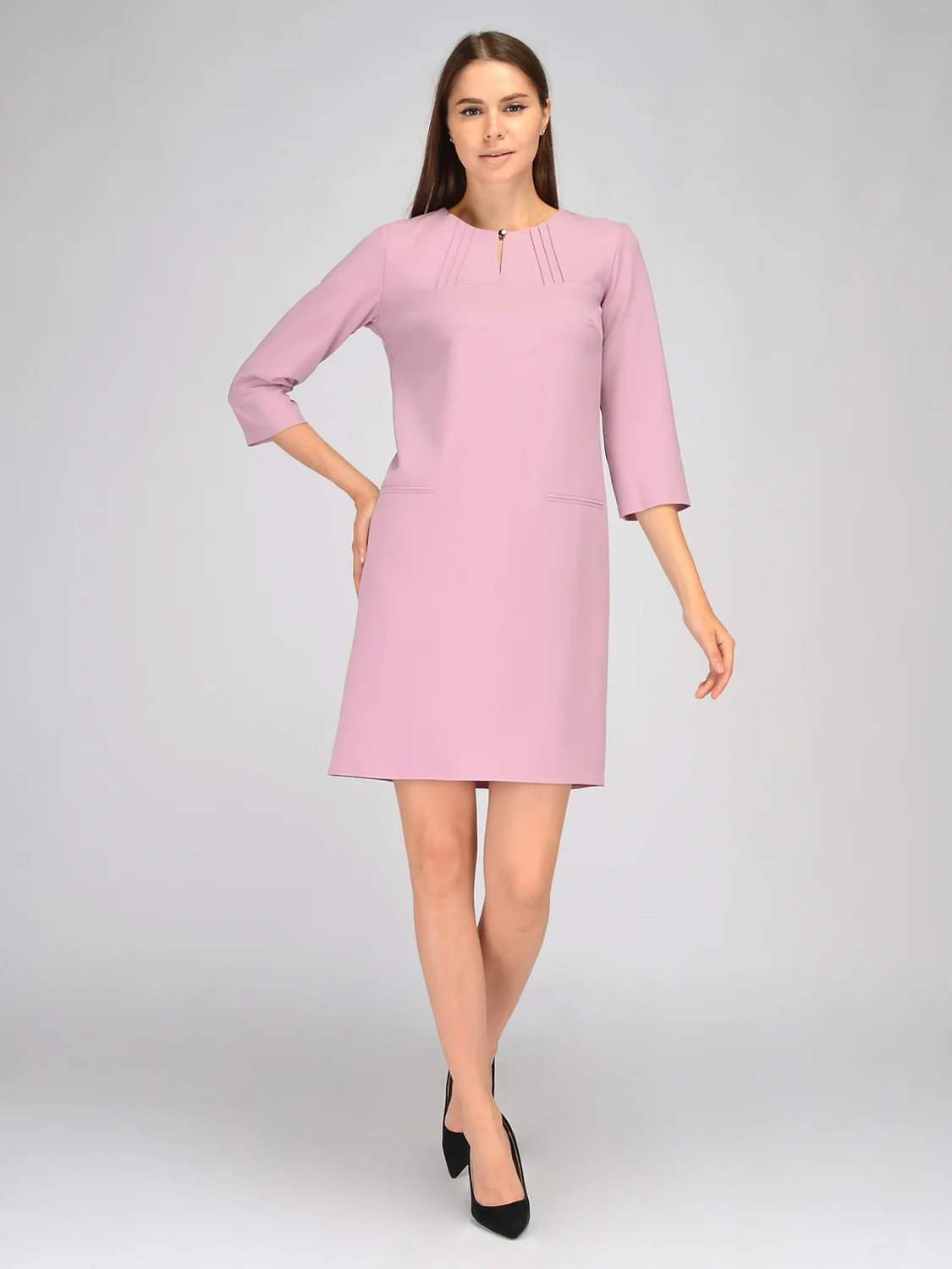 Эффектное женское платье мини с укороченными рукавами три четверти изящно дополнит офисный и праздничный гардероб в осенний сезон. У приталенного платья выше колена аккуратная округлая горловины с вырезом капелька и пуговицей, декоративные строчки на полочке, вытачки и прорезные фальш карманы. Женственное платье смоделирует женственный силуэт и никого не оставит равнодушным.