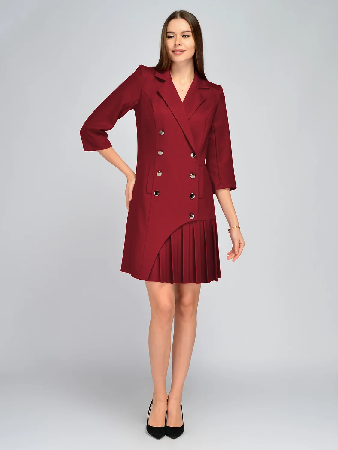 Эффектное платье на запах станет броским дополнением Вашего гардероба для праздников и других значимых событий. Платье мини выполнено из качественной плотной ткани, которая практически не мнется, что обеспечит Вам опрятный вид на протяжении всего вечера. Классический отложной воротник с V-образным вырезом придает образу строгости и сдержанности. Рукава три четверти не сковывают движений и приоткрывают запястья, что позволяет дополнить образ браслетом. Два ряда вертикальных пуговиц визуально вытягивают силуэт и добавляют несколько дополнительных сантиметров росту. Карманов у платья нет, на полочке находятся декоративные клапаны. Главной изюминкой модели является плиссированная мини юбка, которой оформлена только одна половина подола. Надев это платьек пиджак на торжество, свидание или свадьбу, Вы точно не останетесь незамеченной и получите огромное количество комплиментов! Приталенное платье с юбкой плиссе выгодно подчеркнет достоинства фигуры, сделает силуэт более женственным и обеспечит Вас прекрасным настроением!