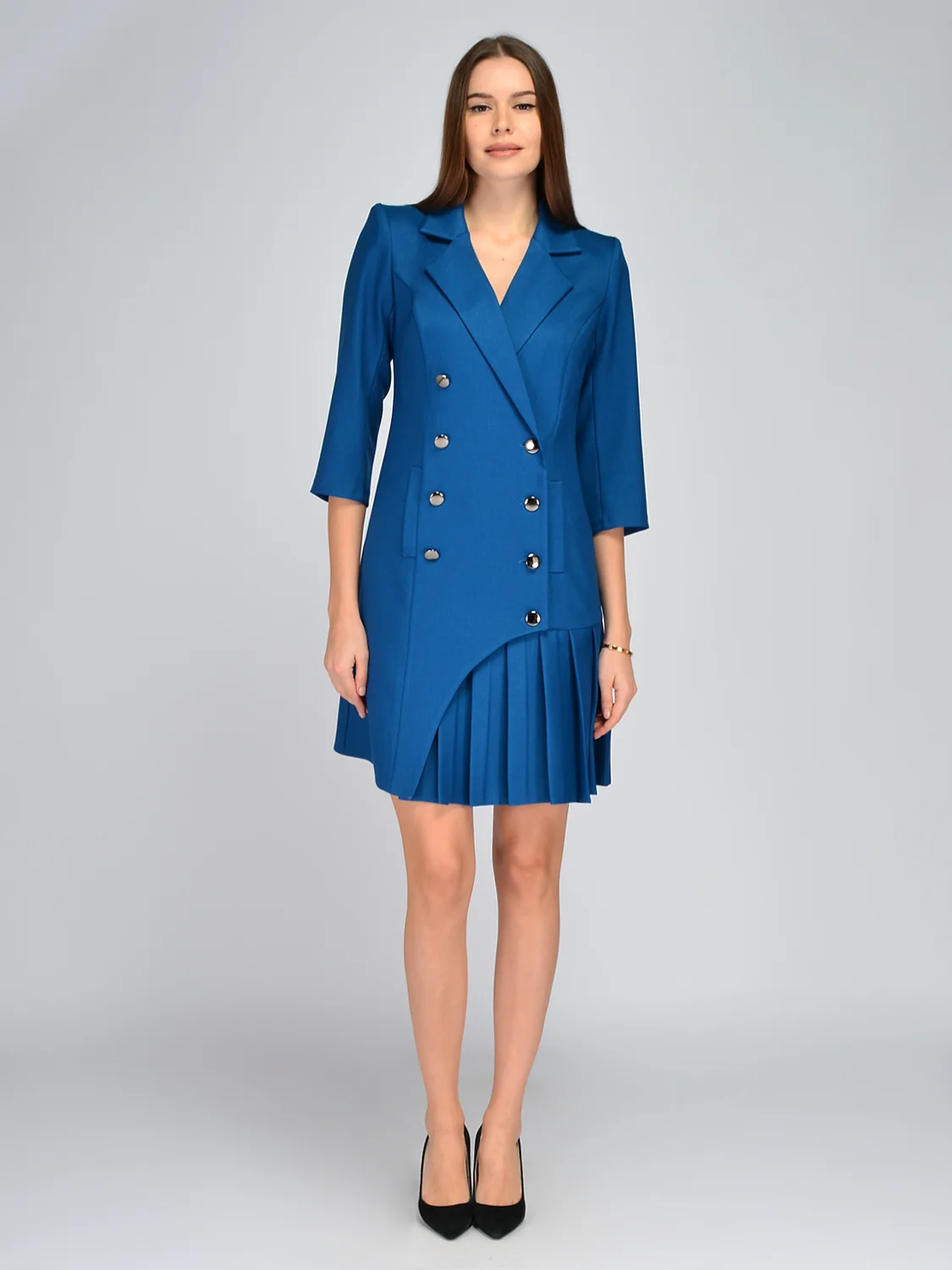 Эффектное платье на запах станет броским дополнением Вашего гардероба для праздников и других значимых событий. Платье мини выполнено из качественной плотной ткани, которая практически не мнется, что обеспечит Вам опрятный вид на протяжении всего вечера. Классический отложной воротник с V-образным вырезом придает образу строгости и сдержанности. Рукава три четверти не сковывают движений и приоткрывают запястья, что позволяет дополнить образ браслетом. Два ряда вертикальных пуговиц визуально вытягивают силуэт и добавляют несколько дополнительных сантиметров росту. Карманов у платья нет, на полочке находятся декоративные клапаны. Главной изюминкой модели является плиссированная мини юбка, которой оформлена только одна половина подола. Надев это платьек пиджак на торжество, свидание или свадьбу, Вы точно не останетесь незамеченной и получите огромное количество комплиментов! Приталенное платье с юбкой плиссе выгодно подчеркнет достоинства фигуры, сделает силуэт более женственным и обеспечит Вас прекрасным настроением!