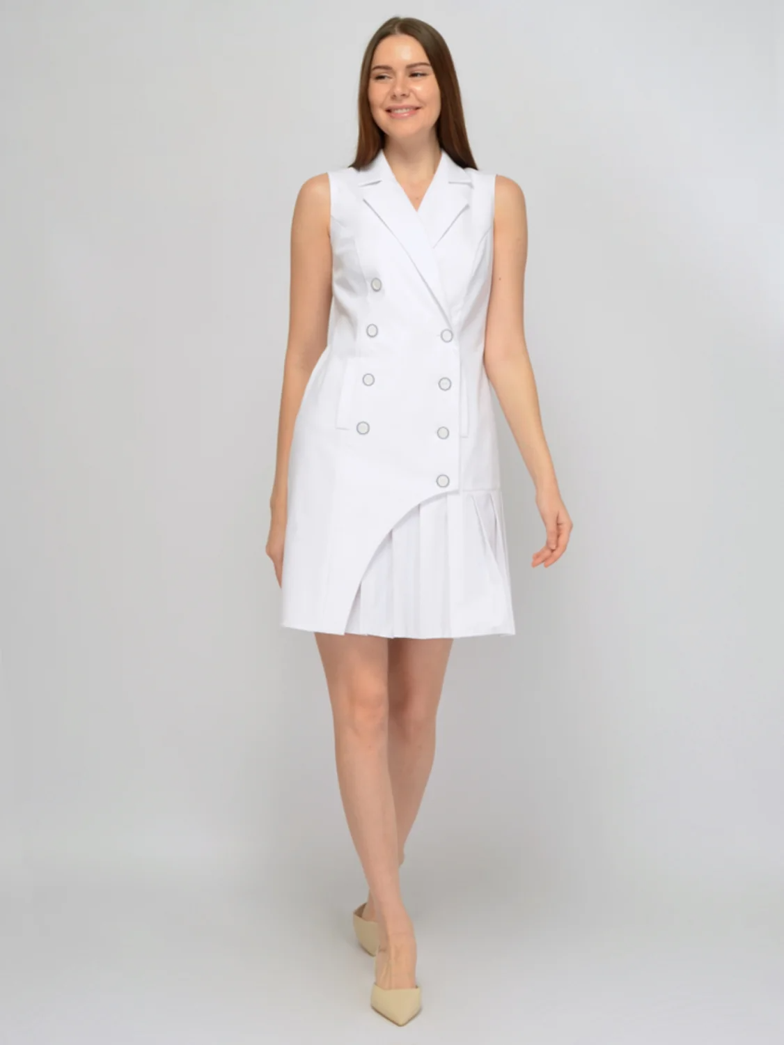 Нарядное летнее платье в свежих расцветках украсит любой Ваш образ! Приталенное платье-пиджак имеет классический отложной воротник с умеренным V-образным вырезом. Застегивается платье мини на пуговицы. Пуговицы располагаются в два ряда. Двубортное платье пиджак выше колена не имеет рукавов, а значит не будет стеснять движений и будет сохранять ощущение свежести. Отличительной особенностью модели является плиссированная юбка со складками. Теннисная юбочка мини делает образ более игривым и молодежным. Классическое платье без рукавов выполнено из натуральной ткани с 95% хлопка в составе. Дышащая ткань позволяет коже дышать, и Вам чувствовать себя комфортно на протяжении всего дня. Натуральная ткань достаточно плотная, поэтому короткое платье не просвечивает. Хлопковое платье пиджак идеально подойдет для офиса, деловых встреч, а также для культурных и праздничных мероприятий летом. Завершите образ удобной обувью на каблуке, украшениями и небольшой сумочкой.