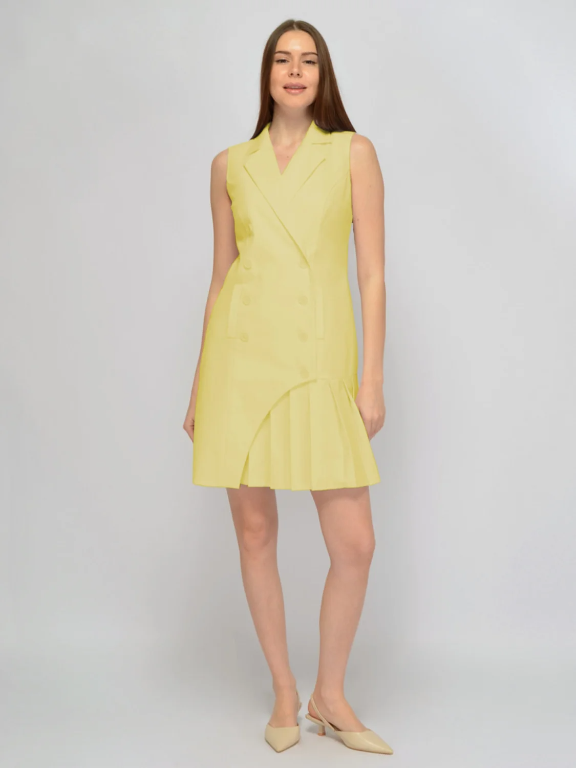 Нарядное летнее платье в свежих расцветках украсит любой Ваш образ! Приталенное платье-пиджак имеет классический отложной воротник с умеренным V-образным вырезом. Застегивается платье мини на пуговицы. Пуговицы располагаются в два ряда. Двубортное платье пиджак выше колена не имеет рукавов, а значит не будет стеснять движений и будет сохранять ощущение свежести. Отличительной особенностью модели является плиссированная юбка со складками. Теннисная юбочка мини делает образ более игривым и молодежным. Классическое платье без рукавов выполнено из натуральной ткани с 95% хлопка в составе. Дышащая ткань позволяет коже дышать, и Вам чувствовать себя комфортно на протяжении всего дня. Натуральная ткань достаточно плотная, поэтому короткое платье не просвечивает. Хлопковое платье пиджак идеально подойдет для офиса, деловых встреч, а также для культурных и праздничных мероприятий летом. Завершите образ удобной обувью на каблуке, украшениями и небольшой сумочкой.