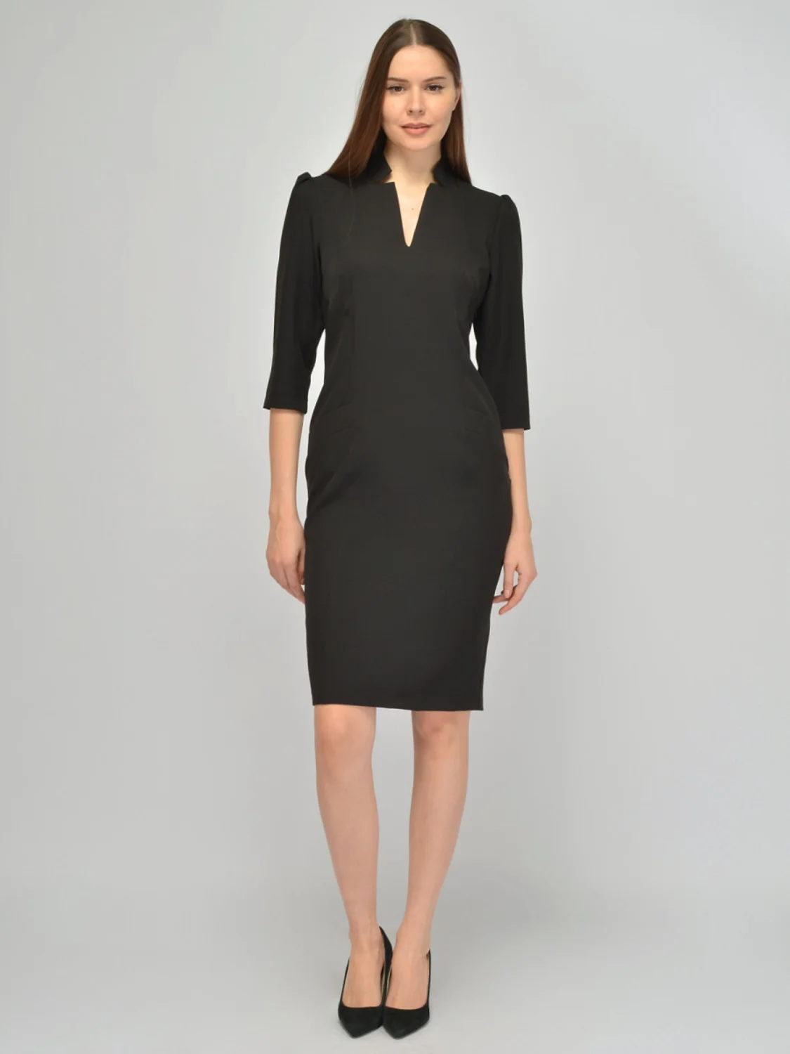 Нарядное платье футляр станет находкой для особых случаев, культурных мероприятий или офисных образов, если они диктуют строгий дресс-код. Воротник-стойка с декоративными вырезами в сочетании с аккуратным V-образным вырезом горловины визуально вытягивают шею и придают образу женственности и притягательности. Укороченные рукава три четверти демонстрируют запястья и предплечья и не сковывают движений. Приталенный силуэт с вытачками на груди подчеркивает изгибы фигуры, создавая пропорции песочные часы. Карманов на платье нет, спереди располагаются декоративные клапаны. Для удобства при ходьбе сзади находится шлица. Застегивается платье миди на потайную молнию сбоку. Праздничное платье до колена выполнено из приятной плотной ткани, которая не подчеркивает несовершенства фигуры и сохраняет опрятный вид на протяжении всего дня. Офисное платье с юбкой карандаш прекрасно сядет на разные типы фигур и выгодно подчеркнет ее достоинства.