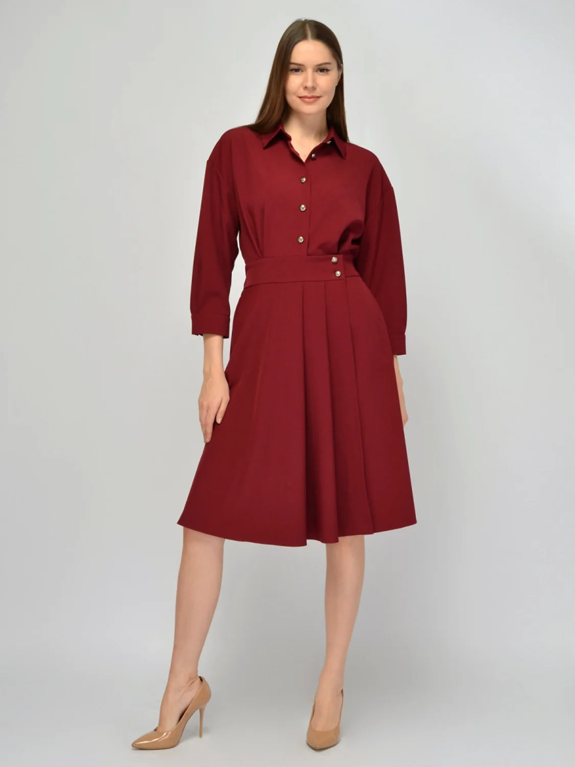 Праздничное платье рубашка в ретро стиле станет выгодной новинкой в Вашем гардеробе. Свободе платье А силуэта выполнено из приятной плотной ткани, которая практически не мнется и сохранит опрятный вид на протяжении всего дня. Отложной воротник придает строгости образы и подчеркивает шейную зону. Укороченные рукава свободного покроя застегиваются на пуговицу. Рукава три четверти со спущенной линией плеча оставляют свободу движений. Все пуговицы на платье трапеции контрастные, что добавляет изюминки всему образы. На талии сзади располагается резинка, чтобы платье идеально село на любую фигуру. Чтобы еще больше подчеркнуть завышенную талию в поясе вшит пояс с пуговицами. Свободная юбка со складками элегантно струится при ходьбе, прибавляя легкости Вашей походке. Универсальный фасон подойдет как молодым девушкам, так и женщинам постарше. Завершите образ обувью на высоком ходу и   подходящими украшениями и аксессуарами.