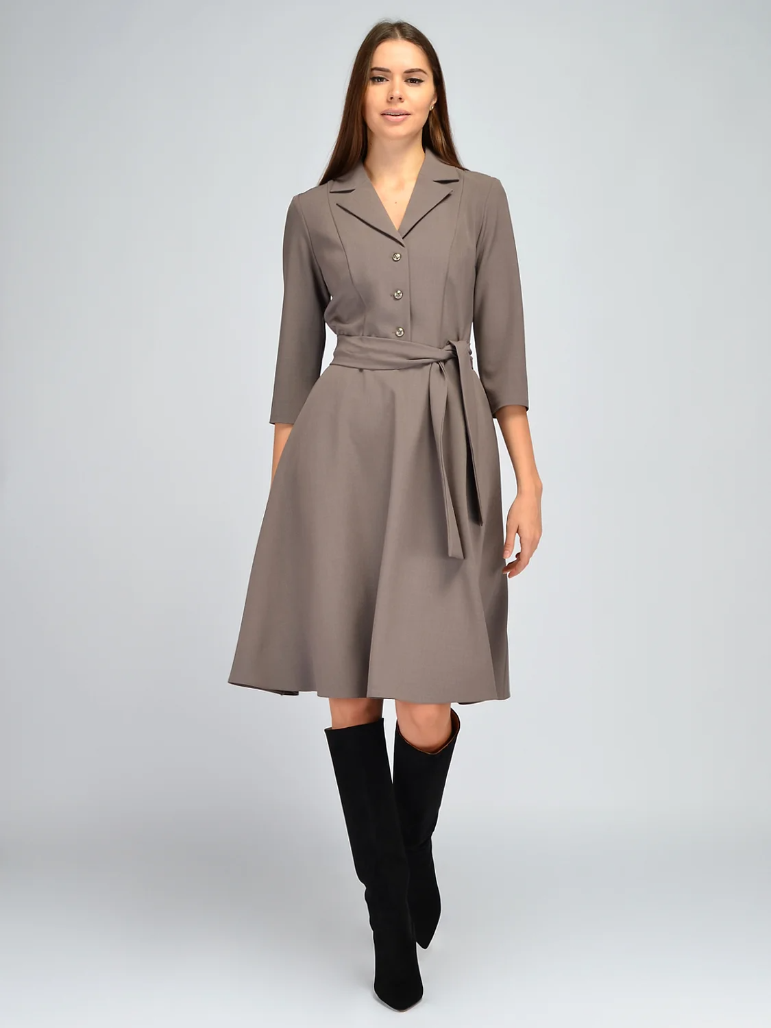 Нарядное платье миди с отложным воротником идеально подойдет не только для торжественного мероприятия, но и для офиса, и на каждый день. У стильного платья классический отложной воротник, переходящий в V-образный вырез горловины, красиво приоткрывая ключицу. Платье до колен имеет застежку пуговицы на полочке. Элегантное платье комплектуется поясом в цвет платья, выгодно подчеркивая талию. Приталенное платье с юбкой колокольчик создает романтичный и женственный образ. Удобные рукава три четверти не сковывают движений. Платье с пышной юбкой позволит Вам чувствовать себя свободно и уверенно, скрывая возможные недостатки фигуры. Вертикальные вытачки визуально вытягивают силуэт. Шикарное платье с юбкой в складку выпускается в широком размерном ряду, в наличии большие размеры плюс сайз plus size. Лаконичный фасон и универсальная длина платья позволяют его носить и взрослым женщинам, и молодым девушкам. Чтобы выглядеть выше и стройнее, выбирайте обувь к платью на высоком каблуке. Не забудьте завершить праздничный образ подходящими украшениями и прической.